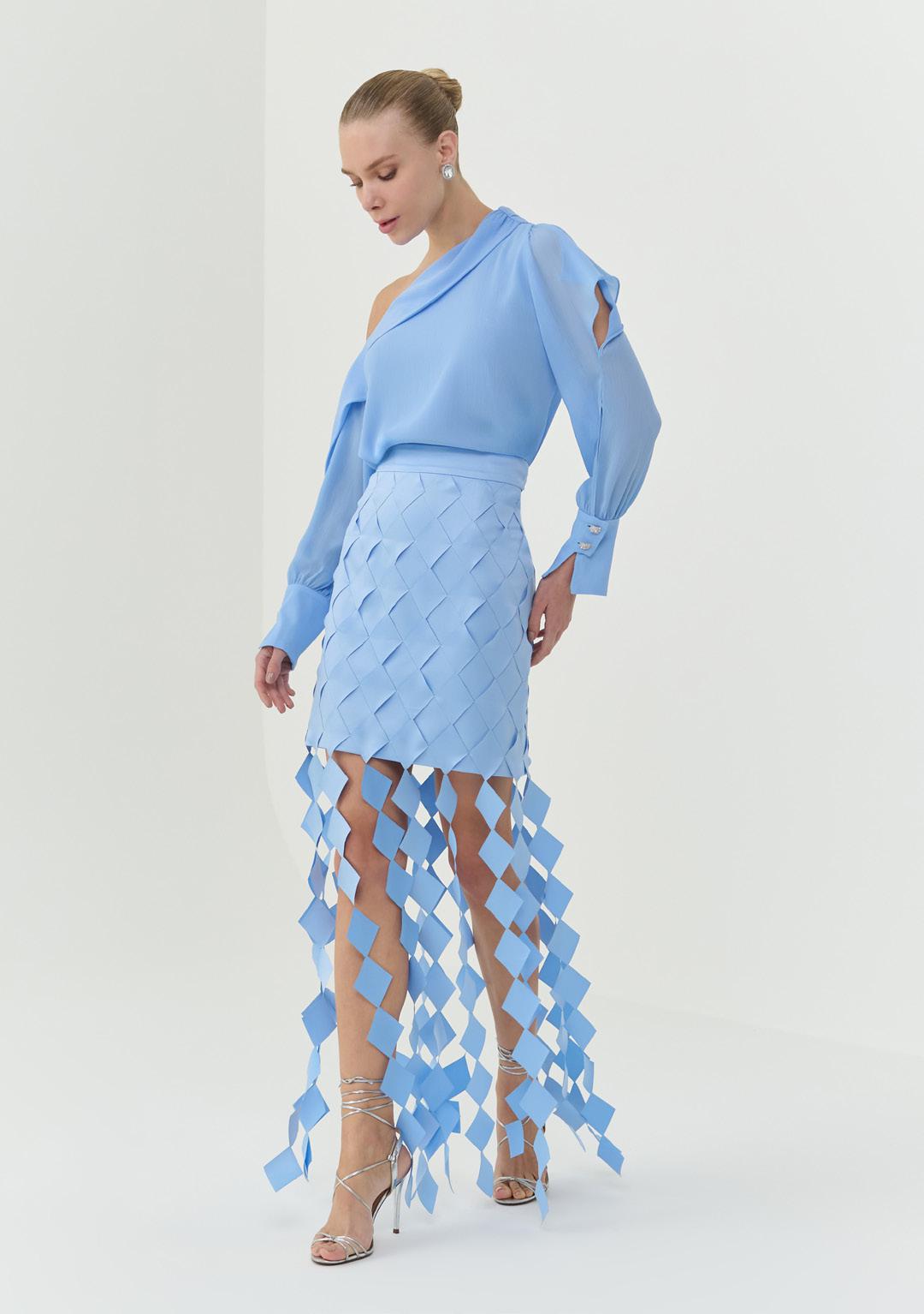 A gola xale adiciona um toque clássico e elegante ao design, enquanto as mangas compridas com recortes geométricos trazem um elemento moderno e exclusivo. Os punhos, adornados com abotoamento de cristais, são um detalhe sutil, mas marcante, que acrescenta um brilho sofisticado à peça, elevando o visual a um novo nível de glamour.
