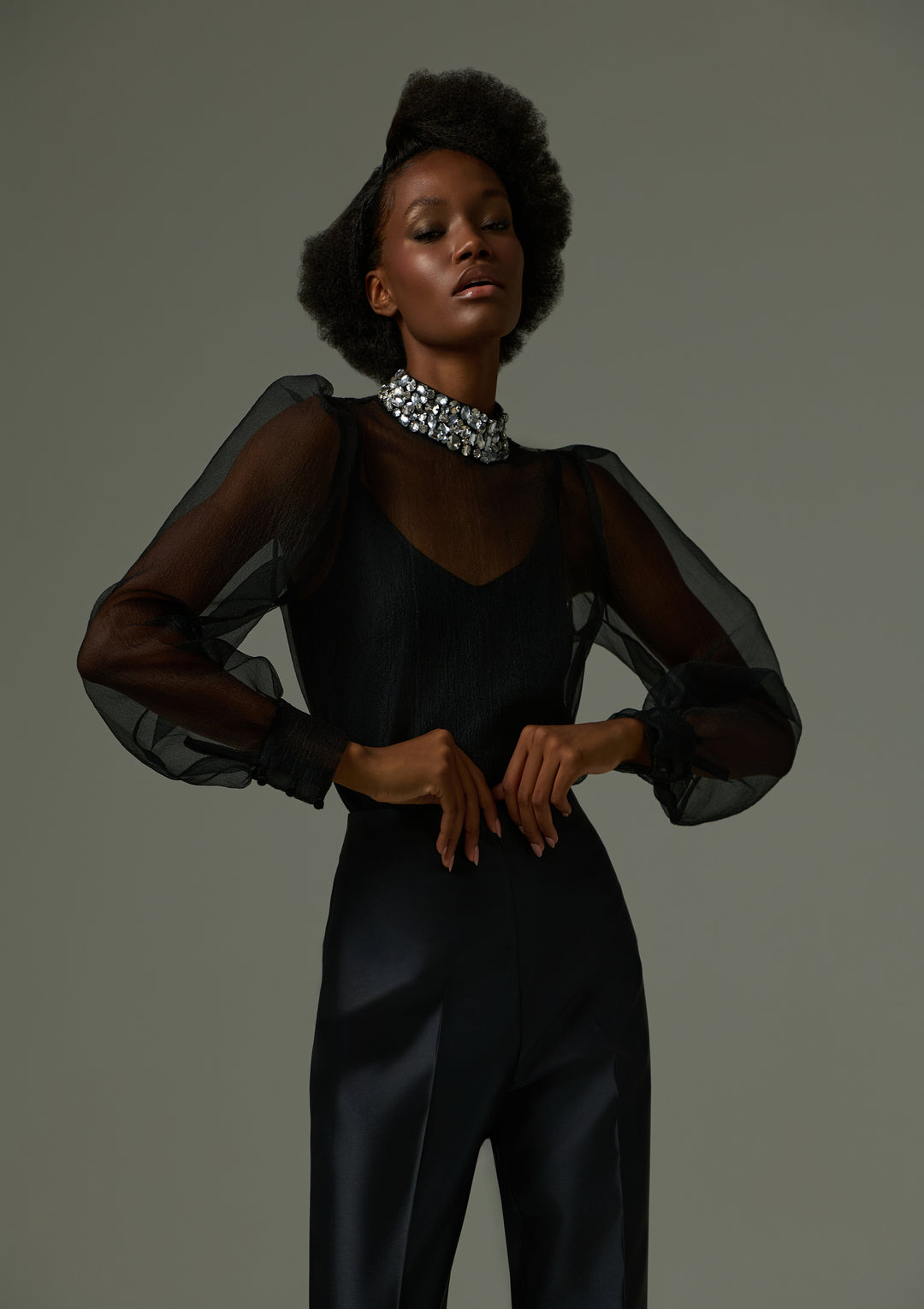 A Blusa Artigas traduz uma sofisticação fluida e impactante. Confeccionada em organza creponada, ela envolve os ombros e os braços com leveza translúcida, revelando uma silhueta feminina com discrição e força. A gola alta inteiramente bordada com pedrarias facetadas traz imponência e transforma a peça em um verdadeiro statement. Acompanha uma camisete em crepe, garantindo conforto e acabamento impecável no uso.