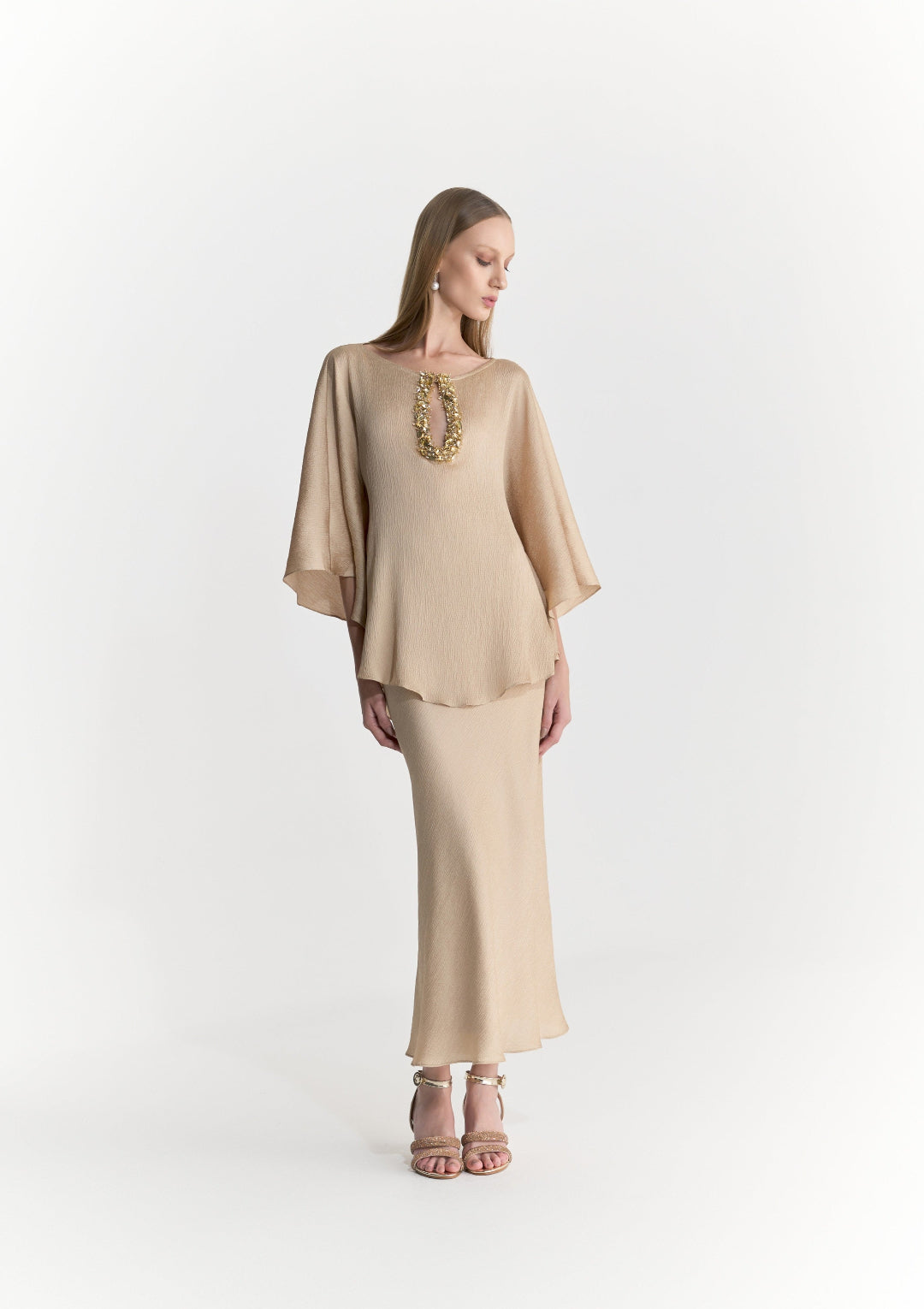 Ideal para ocasiões que exigem refinamento com leveza, essa peça eleva produções diurnas ou noturnas com sofisticação natural. A manga ampla, em estilo fluido, equilibra o brilho do detalhe frontal com uma silhueta elegante e etérea.