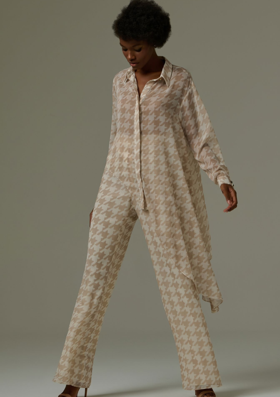 Confeccionada em chiffon de textura delicada e caimento fluido, a calça Angelina apresenta uma estampas exclusivas com pequenos quadros dourados, Pied de Coq e Marble, que conferem sofisticação e modernidade à peça. A modelagem reta alonga a silhueta com elegância, enquanto a transparência suave do tecido cria um visual etéreo e leve. A estrutura da cintura é confortável e precisa, garantindo ajuste impecável sem abrir mão da fluidez.