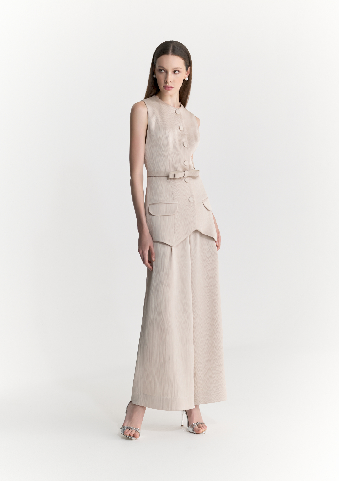 Use com o Colete Elis para um look de conjunto elegante, ou combine com camisas de seda, tops minimalistas ou blazers de alfaiataria. Ideal para eventos formais diurnos, reuniões executivas ou jantares elegantes.