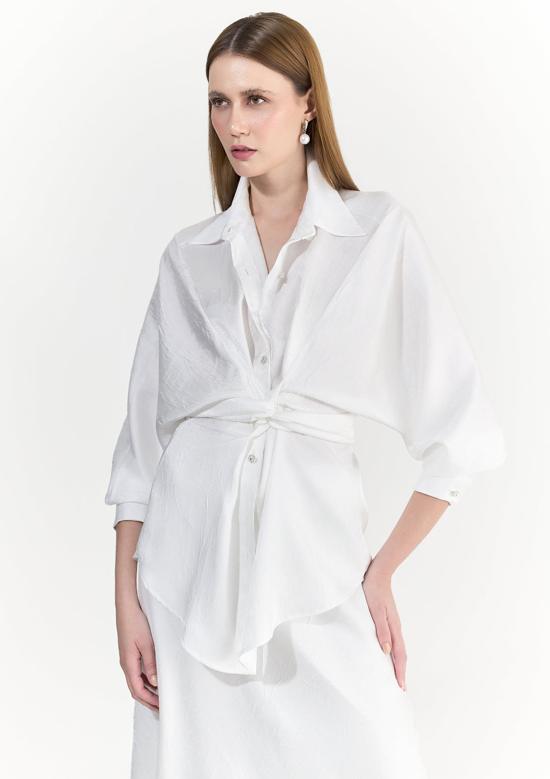 Refinada e atemporal, esta camisa branca da V.Condotti é confeccionada em Textura Trend, um tecido leve e elegante que confere sofisticação discreta à peça. Com modelagem solta e estruturada, a blusa possui gola clássica, abotoamento frontal e amarração na cintura, que permite ajuste personalizado e valoriza a silhueta com naturalidade. As mangas 3/4 com leve volume completam o visual com charme e movimento. A peça traduz com perfeição o estilo contemporâneo da mulher que valoriza elegância sem esforço.