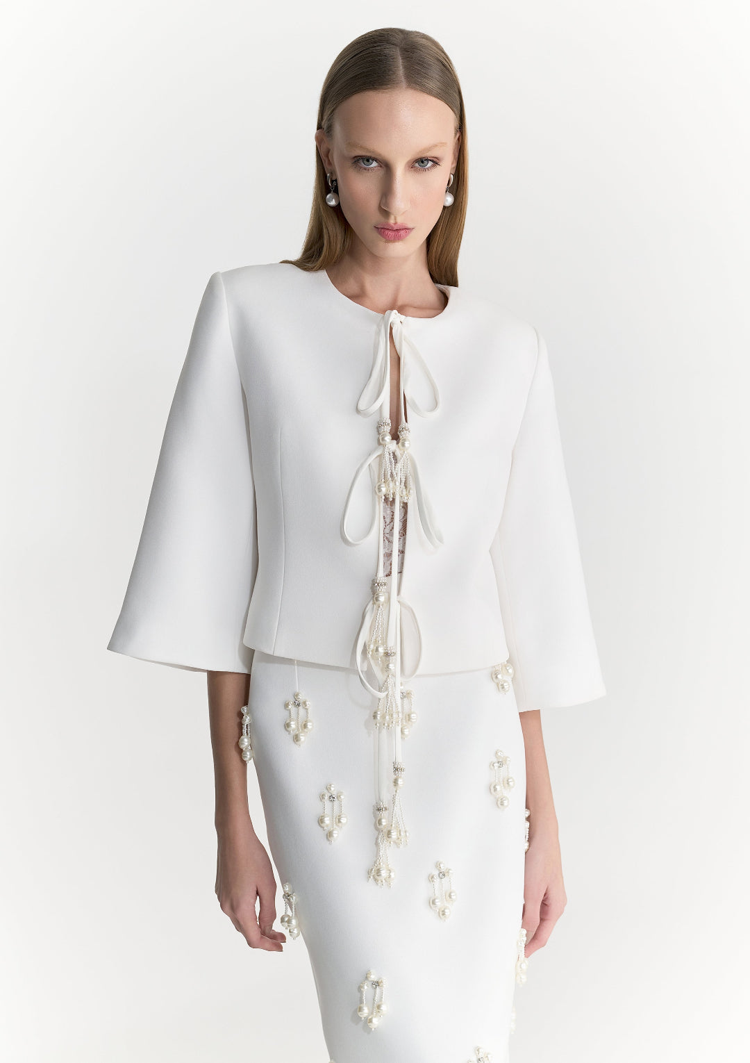Este casaco de crepe Vermont é a definição de sofisticação moderna, com seu corte impecável e detalhes exclusivos em pérolas. A modelagem estruturada e os laços delicados no fechamento trazem um toque de elegância única, enquanto as pérolas aplicadas adicionam um charme sofisticado e contemporâneo.