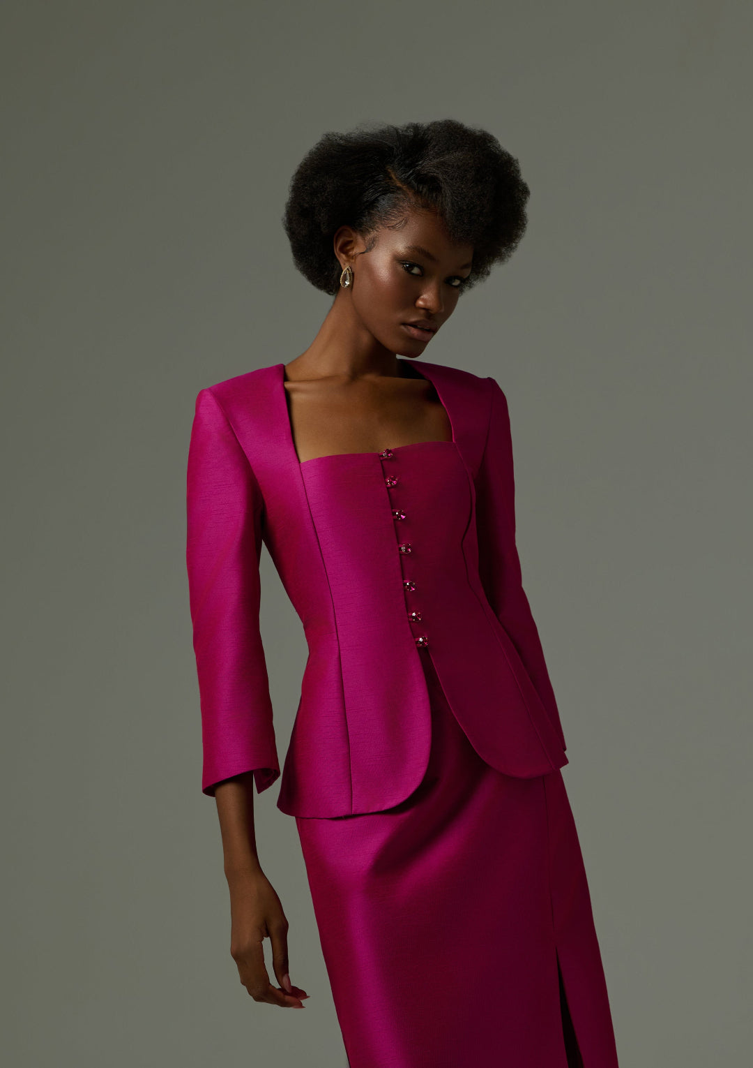 Este casaco em shantung revela uma elegância silenciosa, com sua textura levemente rústica e brilho sutil característicos do tecido. A modelagem alfaiataria slim valoriza a silhueta com precisão, enquanto o decote quadrado confere um toque clássico e atemporal. As mangas 7/8 e a barra arredondada equilibram proporção e leveza, criando uma peça que transita com sofisticação entre o formal e o contemporâneo. O charme final fica por conta do delicado abotoamento com alcinhas e botões de pedraria no tom da peça — um detalhe que eleva o visual com discrição e brilho.