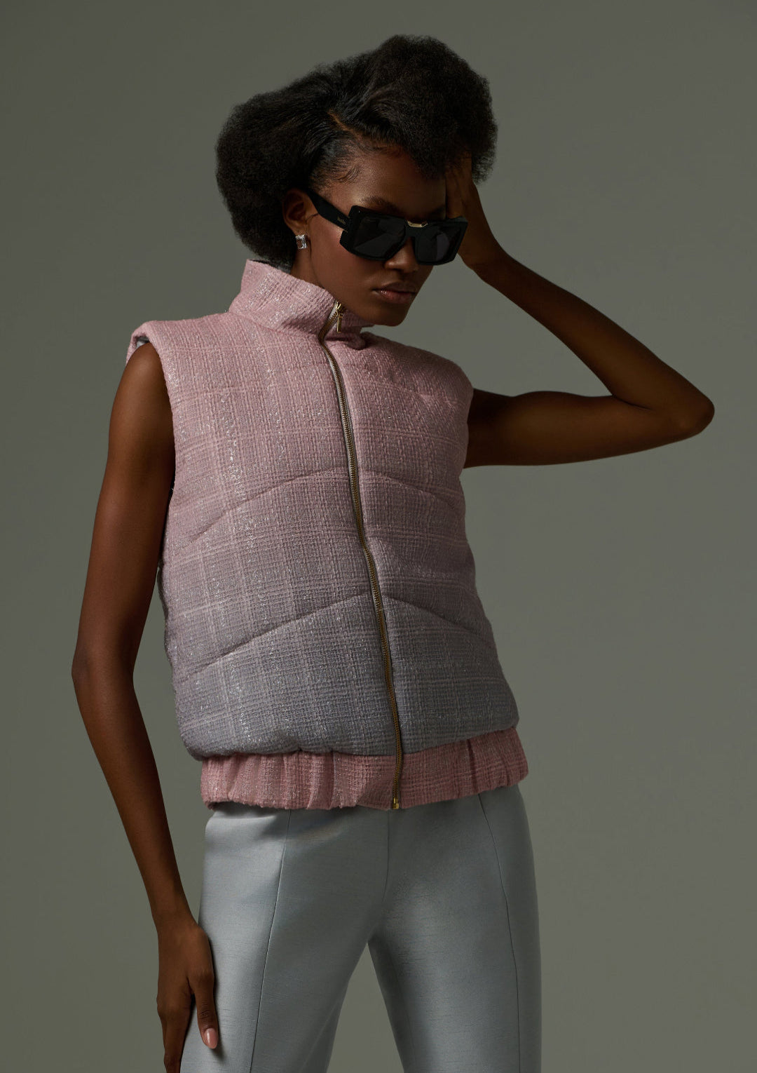 O Colete Bari da V.Condotti é a tradução perfeita da elegância funcional. Confeccionado em tweed encorpado com acabamento acetinado, a peça eleva o clássico puffer a um novo patamar de sofisticação. A modelagem sem mangas e levemente estruturada destaca a silhueta feminina de forma refinada. Seu fechamento frontal com zíper dourado confere modernidade, enquanto o jogo de tonalidades rosé e cinza cria um visual delicado e contemporâneo.
