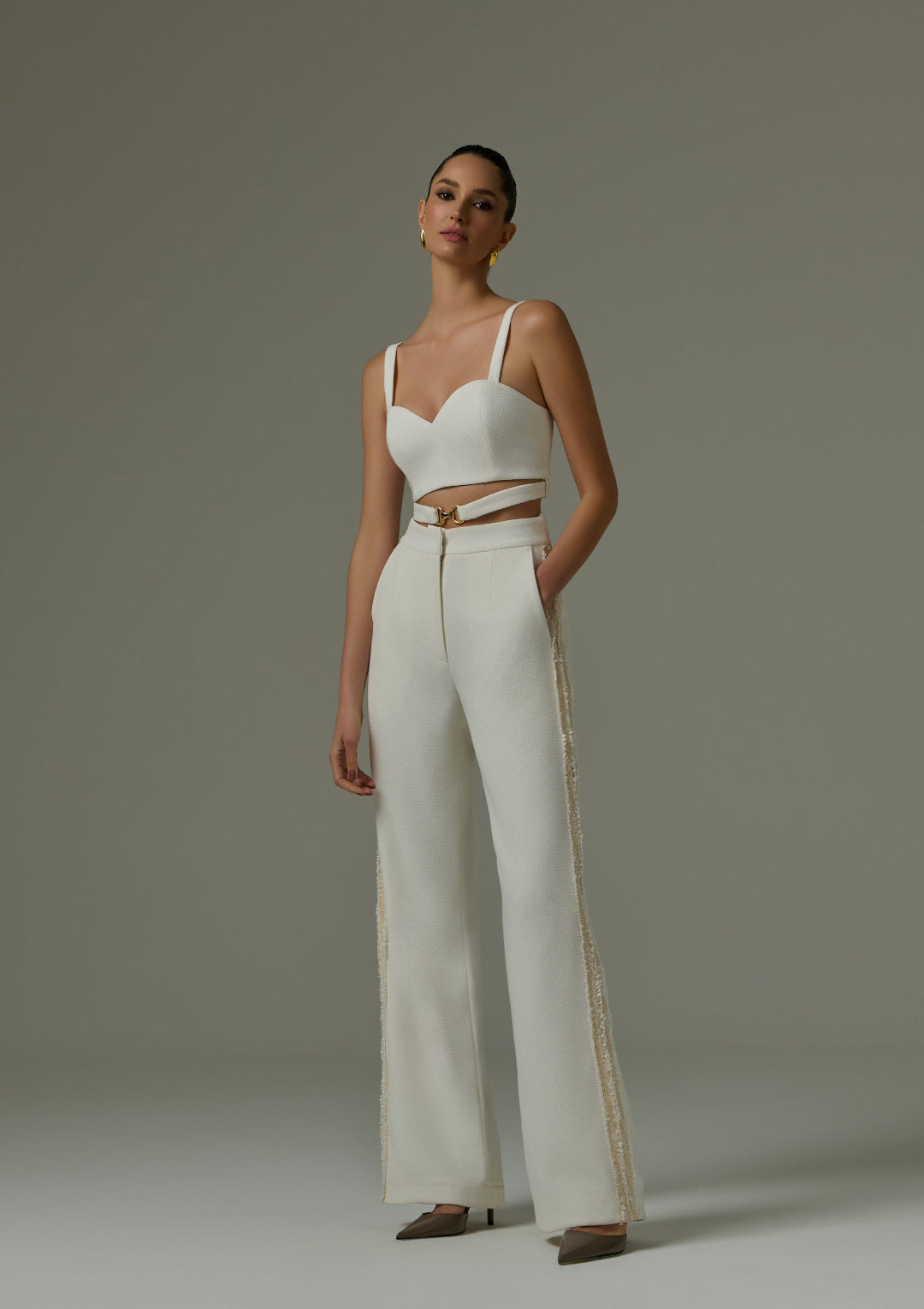 Este cropped une elegância e modernidade em uma peça estruturada e cheia de personalidade. Confeccionado em Tweed Craft, traz um acabamento texturizado e um toque artesanal sofisticado. O decote coração realça o colo, enquanto as barbatanas internas garantem sustentação e conforto, modelando o corpo com segurança. O detalhe frontal vazado com argolas metálicas adiciona um charme contemporâneo, enquanto o fechamento em zíper dourado aparente nas costas reforça o caráter urbano e moderno da peça. As alças largas proporcionam equilíbrio e conforto, tornando este top perfeito para composições elegantes e ousadas.