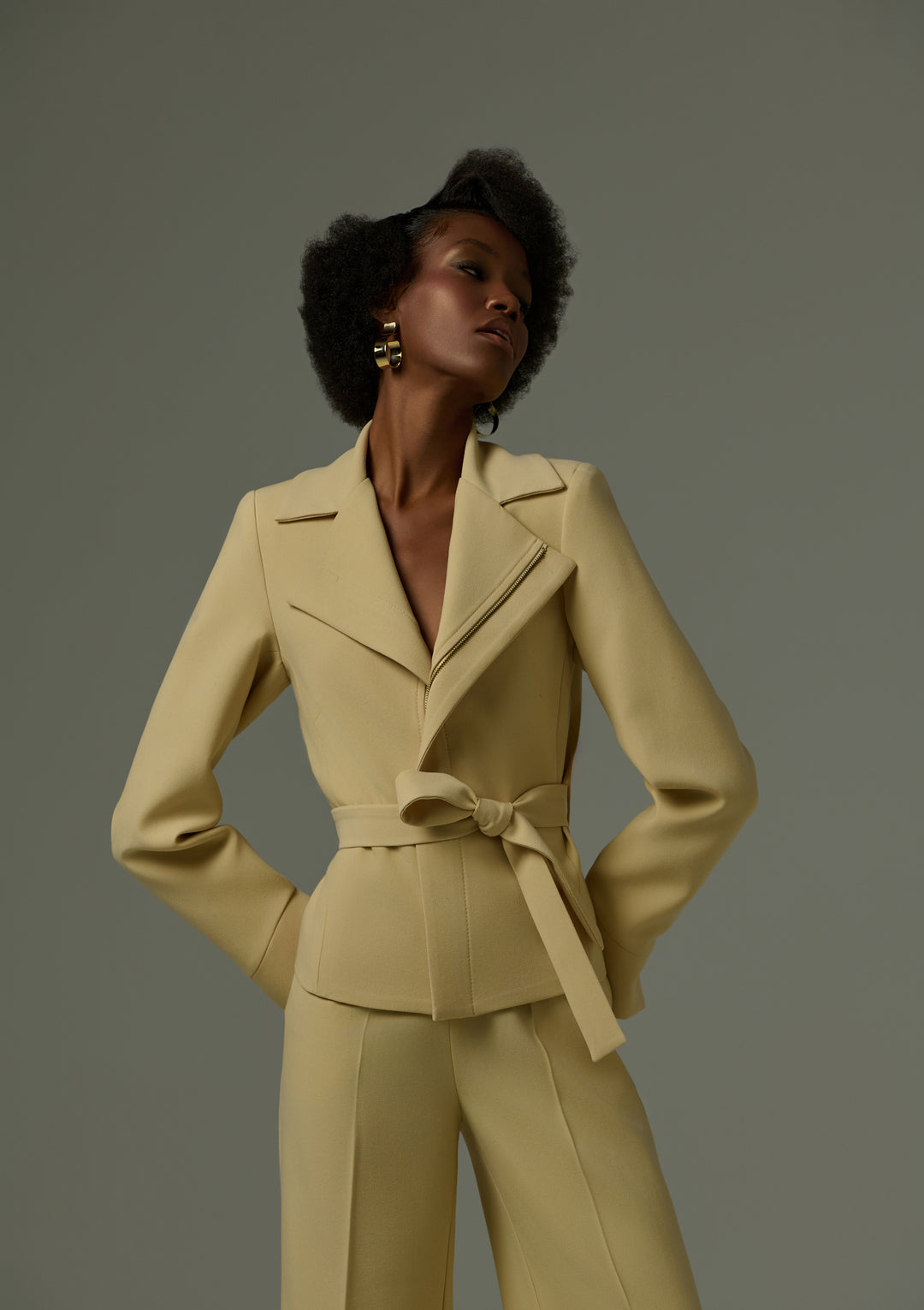A Jaqueta Arequipa foi criada para mulheres que dominam com elegância e se expressam com precisão. Confeccionada em crepe Miu Miu tecido encorpado, de toque refinado e leve elasticidade, esta peça entrega estrutura impecável e sofisticação no detalhe. O recorte alfaiataria é valorizado por lapelas amplas, fechamento transversal e um cinto-faixa do mesmo tecido, que define a cintura com leveza e presença.
