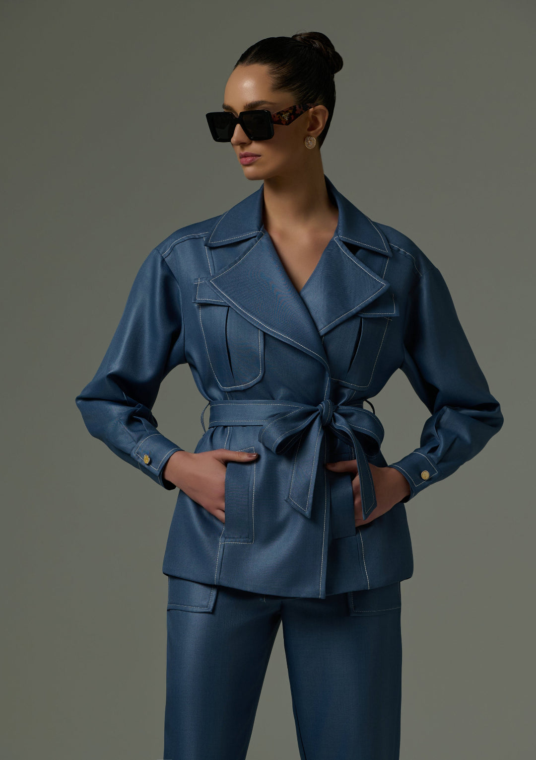 Este trench coat curto em denim traz a fusão perfeita entre elegância e atitude contemporânea. Sua modelagem levemente ampla com ombros no lugar, proporciona um caimento impecável, enquanto os bolsos faca e utilitários adicionam funcionalidade ao design. O fechamento trespassado, ajustado pela faixa, valoriza a cintura e destaca a silhueta com sofisticação. O charme extra fica por conta dos pespontos aparentes em cor contrastante, que imprimem um toque de autenticidade e estilo.