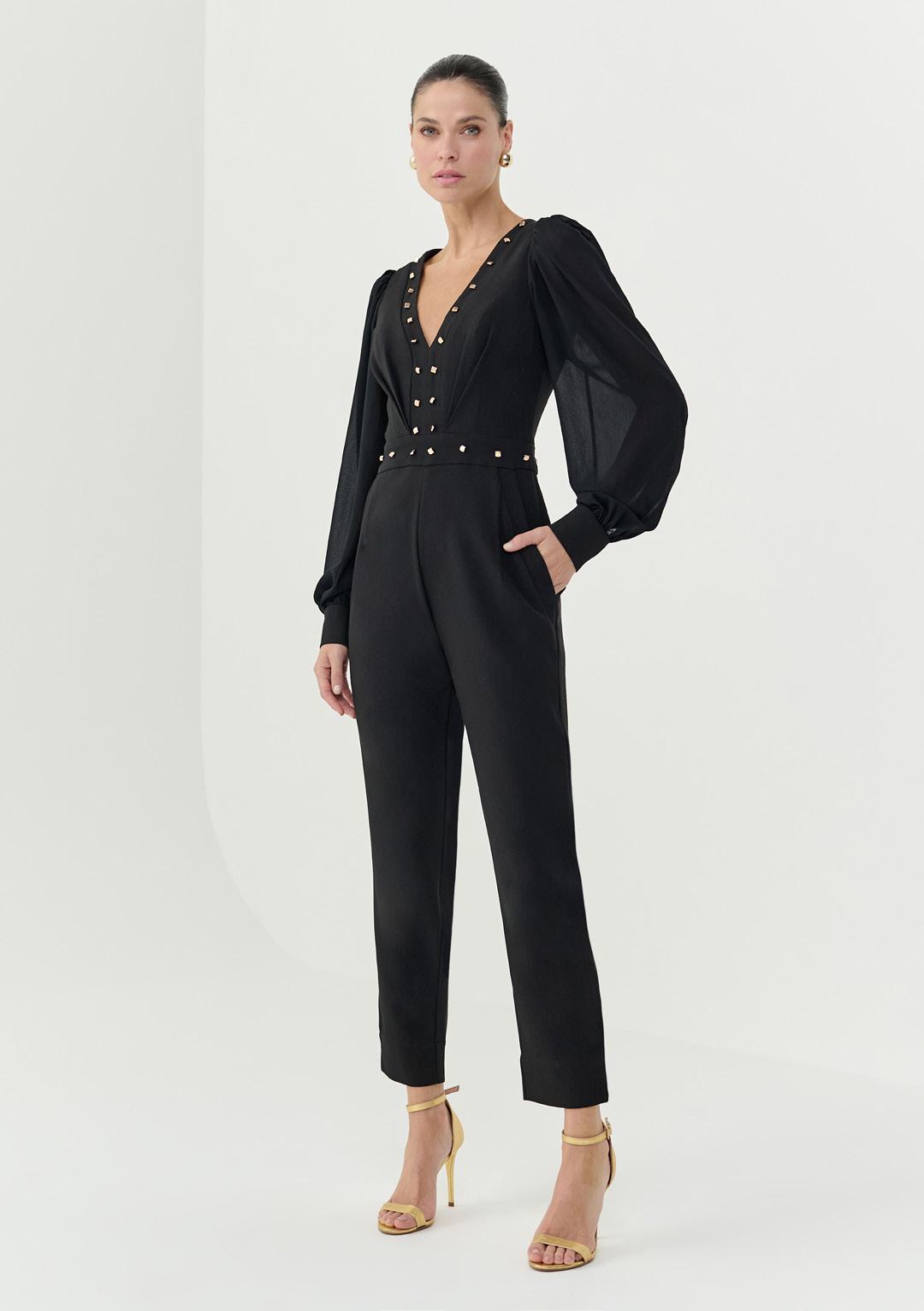 Elaborado com um tecido nobre como o crepe Valentino, o macacão possui uma modelagem de alfaiataria impecável, garantindo um caimento perfeito que realça a silhueta feminina. O decote V profundo é adornado com mini spikes douradas, que também marcam a cintura, criando um efeito de brilho sutil e sofisticado.