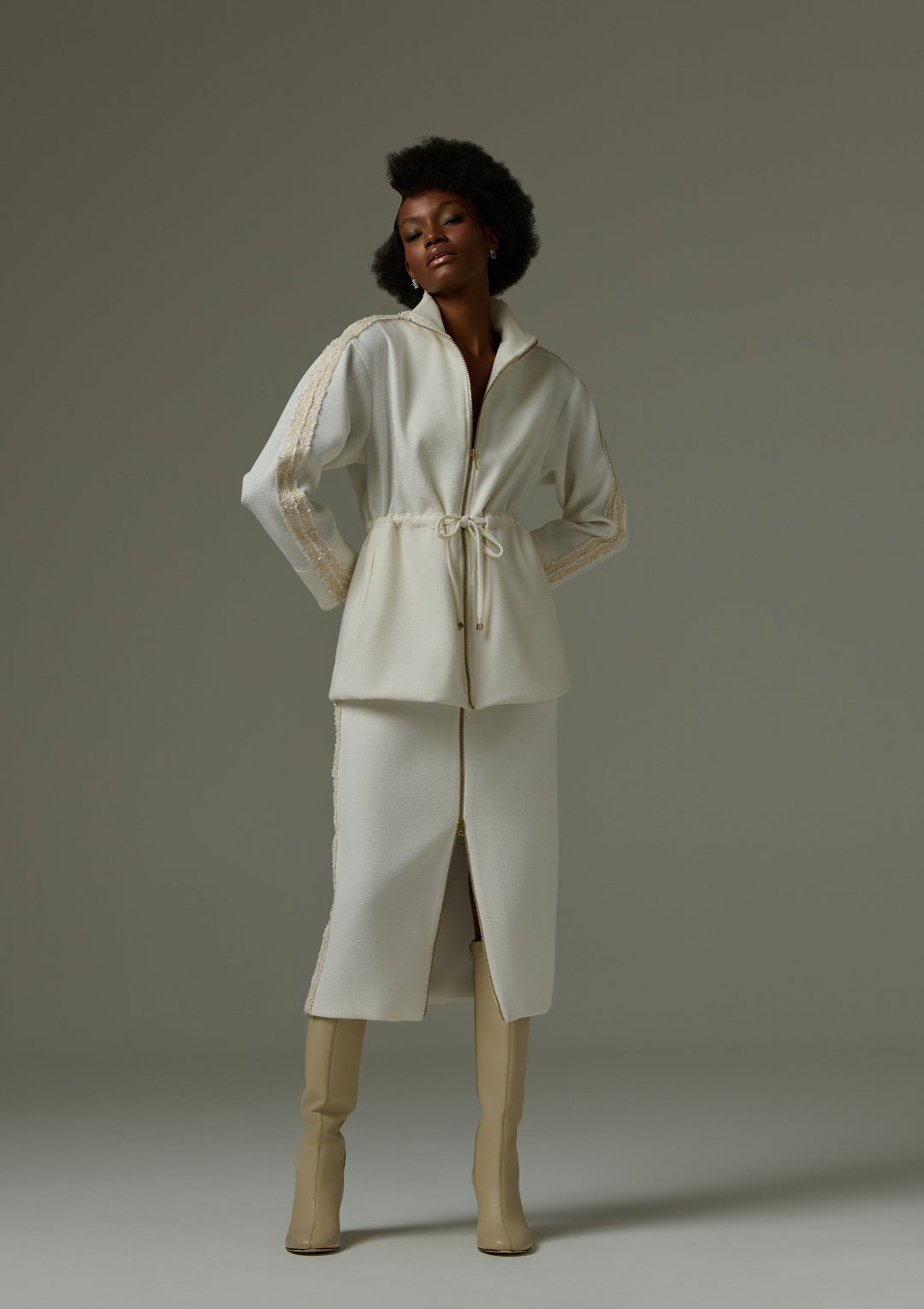 Com design sofisticado e toque artesanal, esta parka em tweed craft imprime um visual refinado e contemporâneo. A modelagem versátil ganha personalidade com a aplicação de fita em tom cru nas laterais das mangas, enriquecida por delicados pespontos dourados que adicionam brilho sutil ao look. O ajuste na cintura com amarração valoriza a silhueta e confere funcionalidade sem abrir mão da elegância.