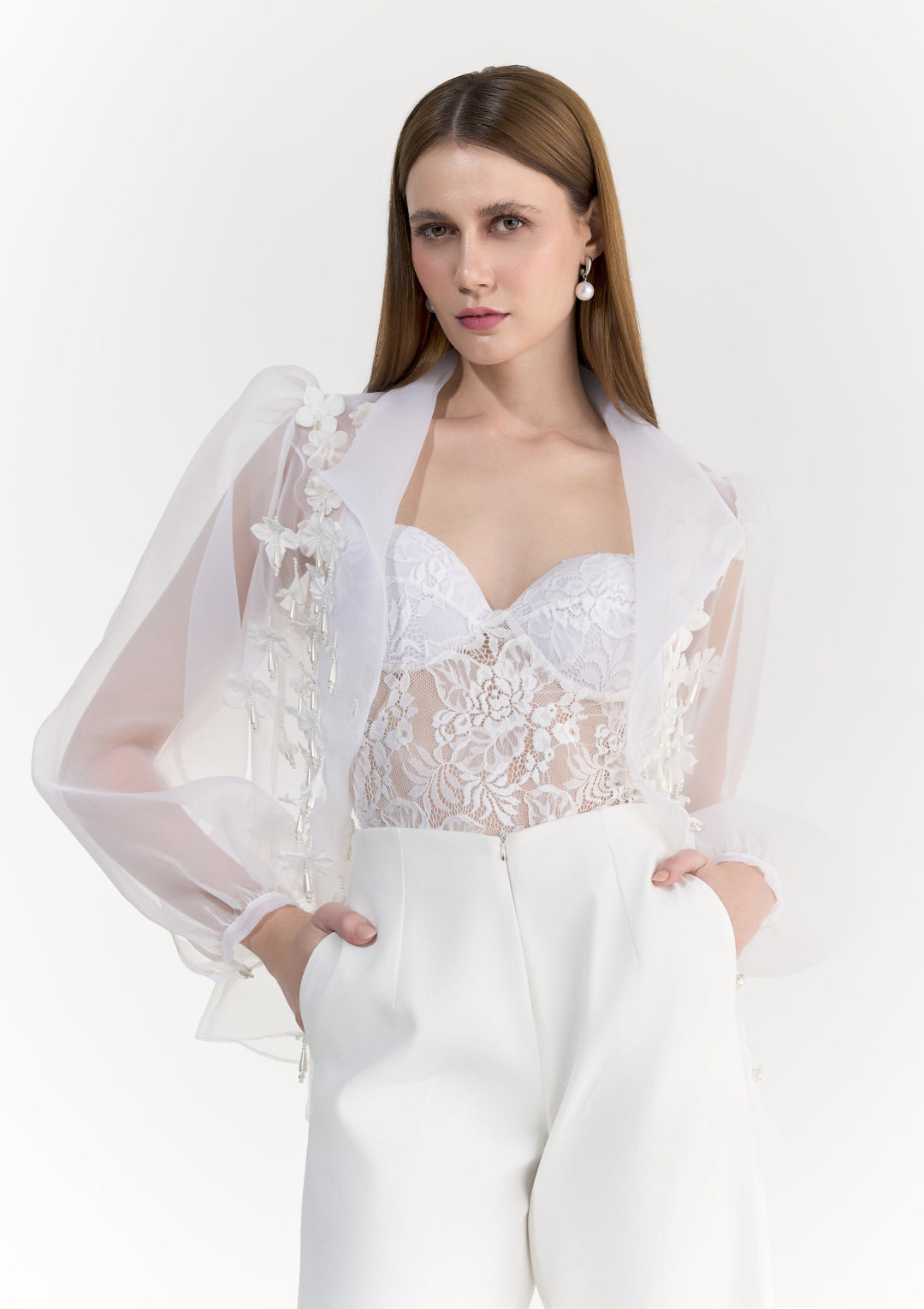 A composição em tule e renda cria contrastes sutis que tornam a peça atemporal e versátil. Ideal para composições refinadas, ela pode ser usada como protagonista ou sob sobreposições translúcidas, elevando o look com requinte.