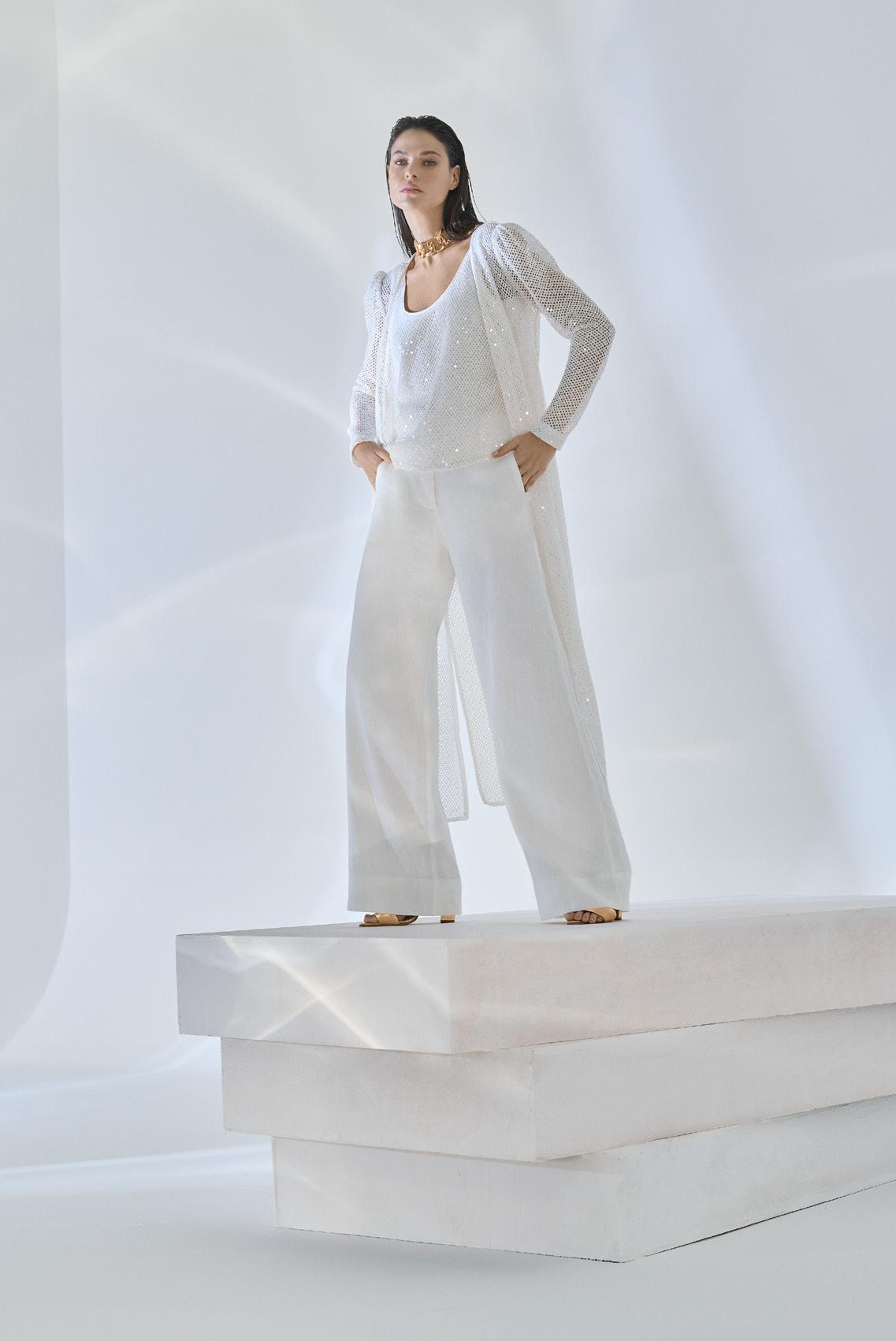 Regata Samara é uma peça clássica e sofisticada. Seu decote redondo e o elegante trabalho em crochê com paetês tridimensionais garantem um visual exclusivo. Sua modelagem solta e confortável proporciona elegância e conforto em todas as ocasiões. Aproveite toda a sofisticação desta regata em seus looks.