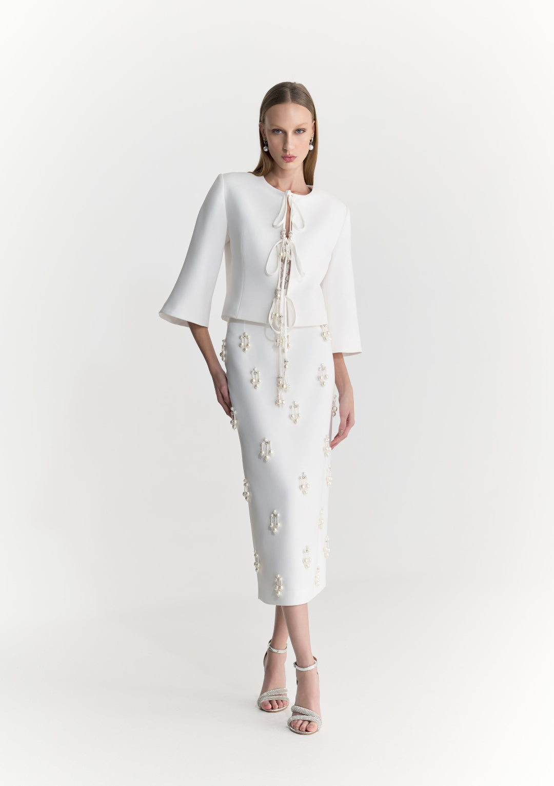 Esta saia de Crepe Vermont é a definição de elegância e refinamento. Com seu corte midi e detalhes em pérolas, ela traz um toque de sofisticação à silhueta feminina, tornando-a perfeita para eventos formais ou ocasiões que exigem um look elegante e imponente.