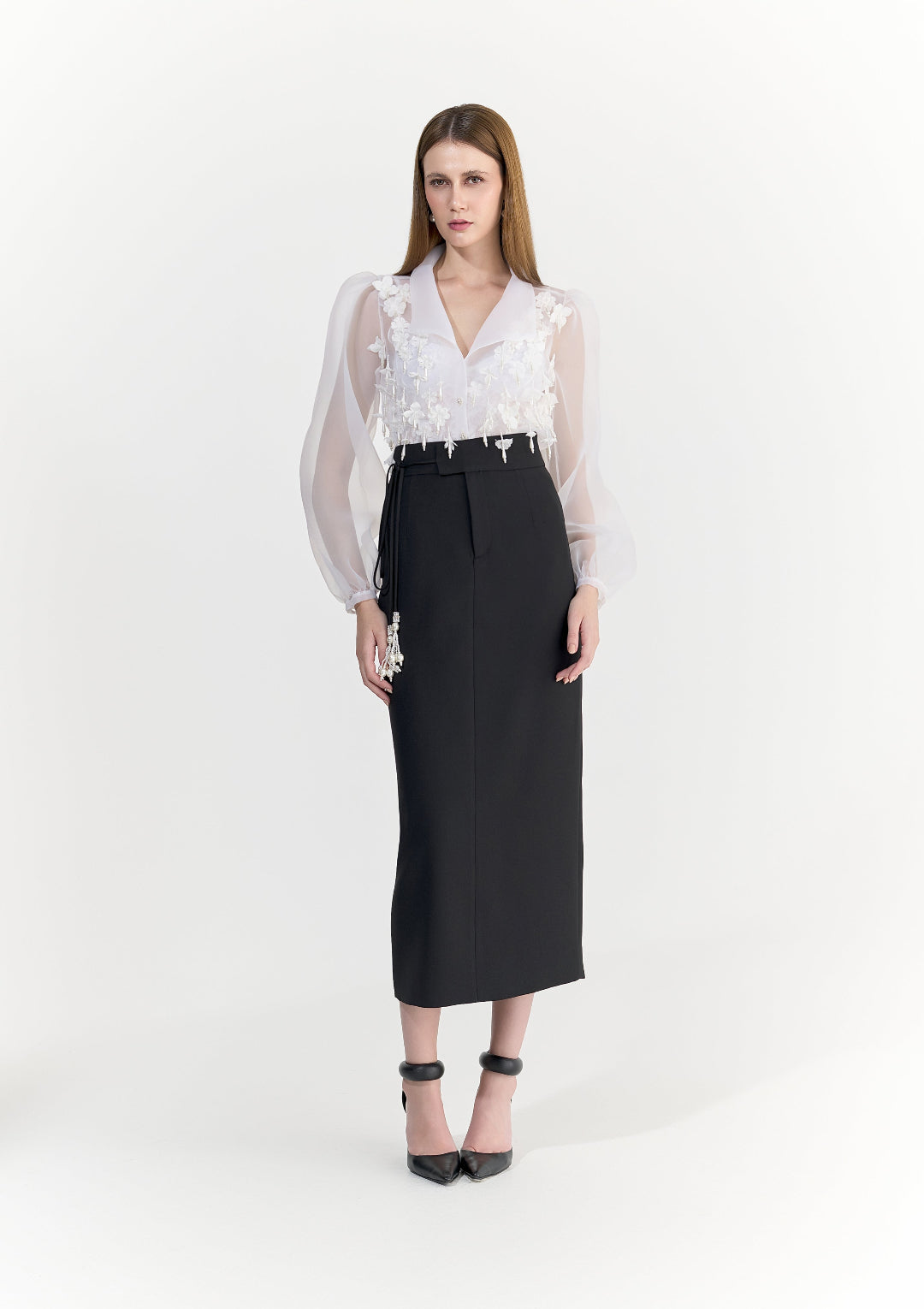 Combine esta saia com a blusa de organza da coleção para um visual refinado. Adicione sandálias de salto alto e joias discretas, como brincos de pérola, para completar o look elegante. Perfeita para eventos noturnos e ocasiões que exigem sofisticação.