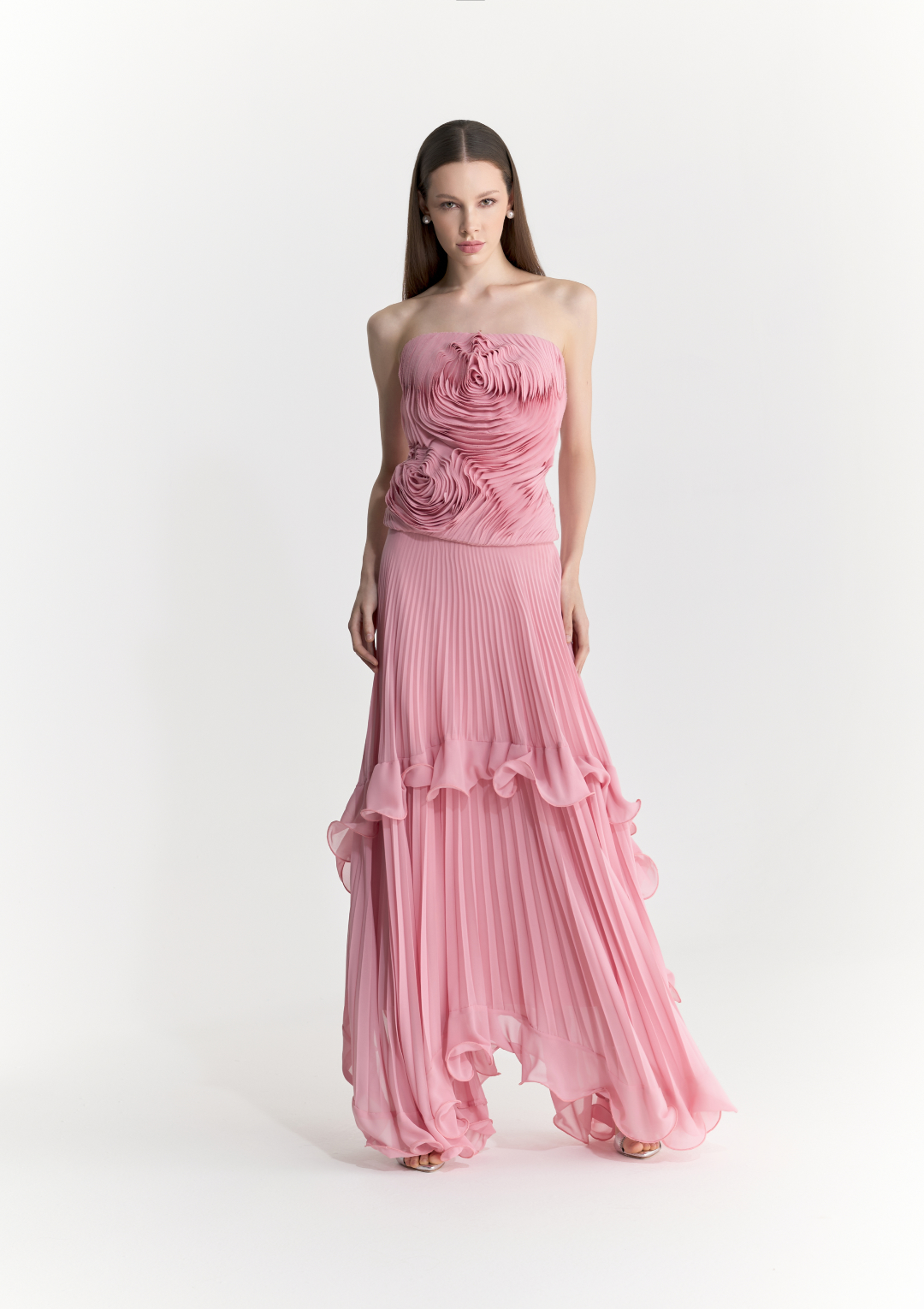 Ideal para eventos casuais, cocktail ou festas formais. Combine com o top tomara-que-caia plissado em chiffon Saab para um visual monocromático e imponente. Finalize com sandálias de salto fino e clutch minimalista.