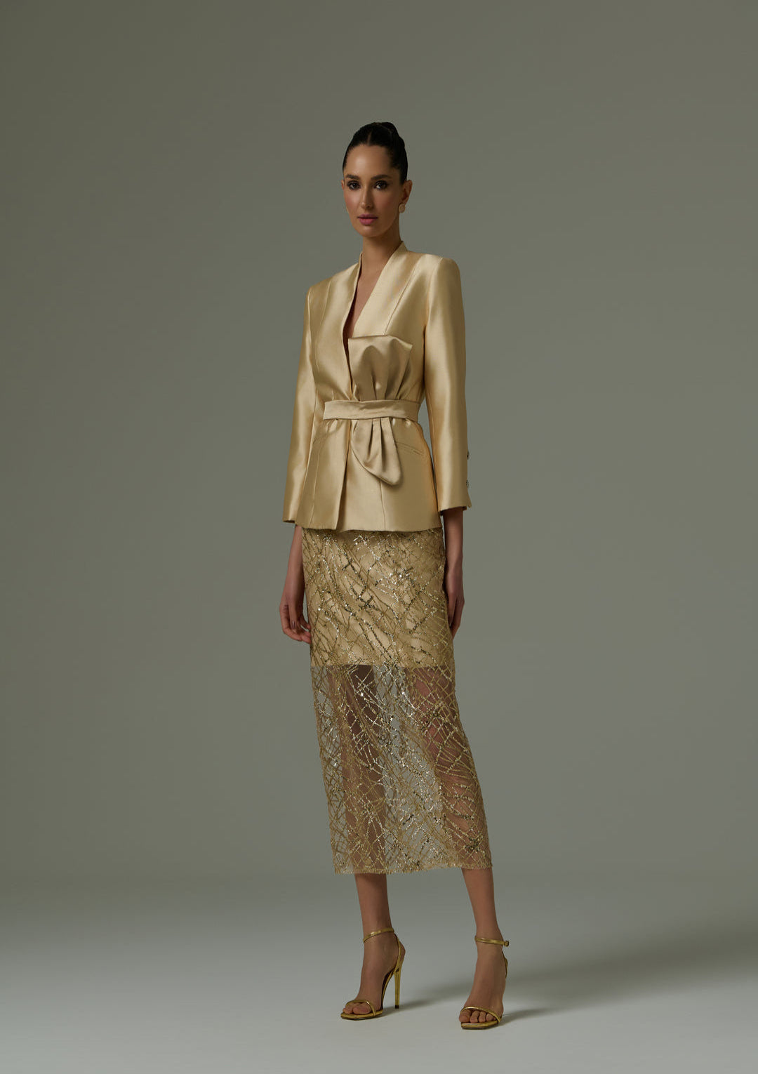 A Saia Sônia é uma celebração da sofisticação elevada ao detalhe. Composta por uma base estruturada em zibeline de brilho acetinado e uma sobreposição delicada em tule bordado com glitter, esta peça cria uma composição de profundidade visual e contraste perfeito entre firmeza e leveza. A modelagem reta com comprimento midi valoriza a silhueta e alonga o corpo com naturalidade, enquanto o tule bordado revela sutilmente as pernas com charme etéreo e presença marcante.