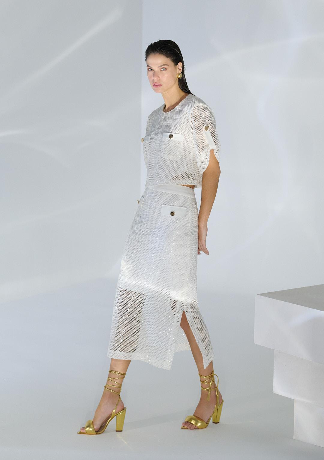 Modernidade define a Saia Stephane, uma peça concebida para as mulheres que valorizam o artesanato de luxo e a moda exclusiva. A combinação de tela crochê e bordado em paetê transparente cria uma textura visual e tátil que é tanto inovadora quanto encantadora. O efeito molhado do paetê reflete a luz de maneira sutil, criando um brilho que é ao mesmo tempo discreto e impactante.