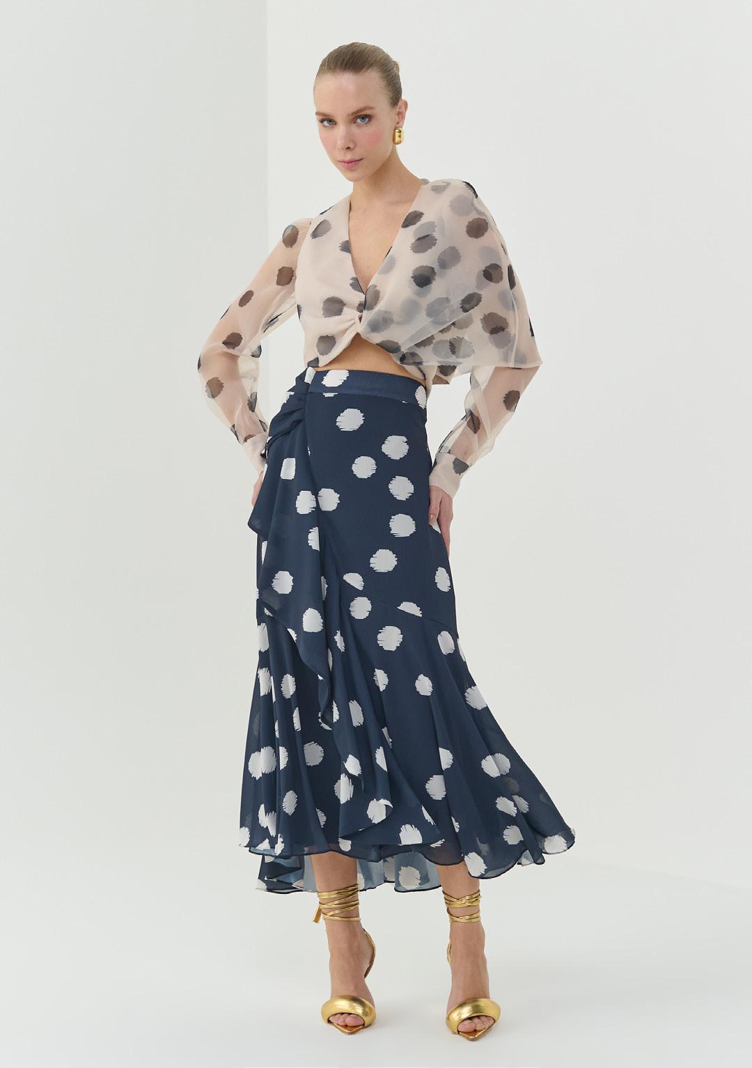 Uma peça que transpira feminilidade e atitude contemporânea! Nossa saia midi em chiffon traz a estampa maxi poa que vai conquistar seu look instantaneamente. A modelagem levemente solta promove conforto e liberdade, perfeita para quem busca autenticidade no vestir. A nesga transversal, que nasce na cintura e desce até a barra, cria um caimento impecável, valorizando cada curva.
