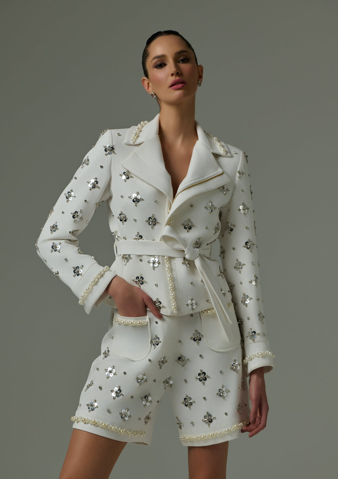 Este shorts em crepe Zurique traduz sofisticação com uma pegada moderna e feminina. Com modelagem alfaiataria e caimento impecável, a peça tem sua parte frontal inteiramente bordada à mão com um elegante desenho de trevos em lantejoulas, strass e miçangas — uma verdadeira joia em forma de roupa. Para arrematar, os bolsos e a barra são contornados por um delicado bordado de pérolas, criando um contraste sutil entre brilho e suavidade.