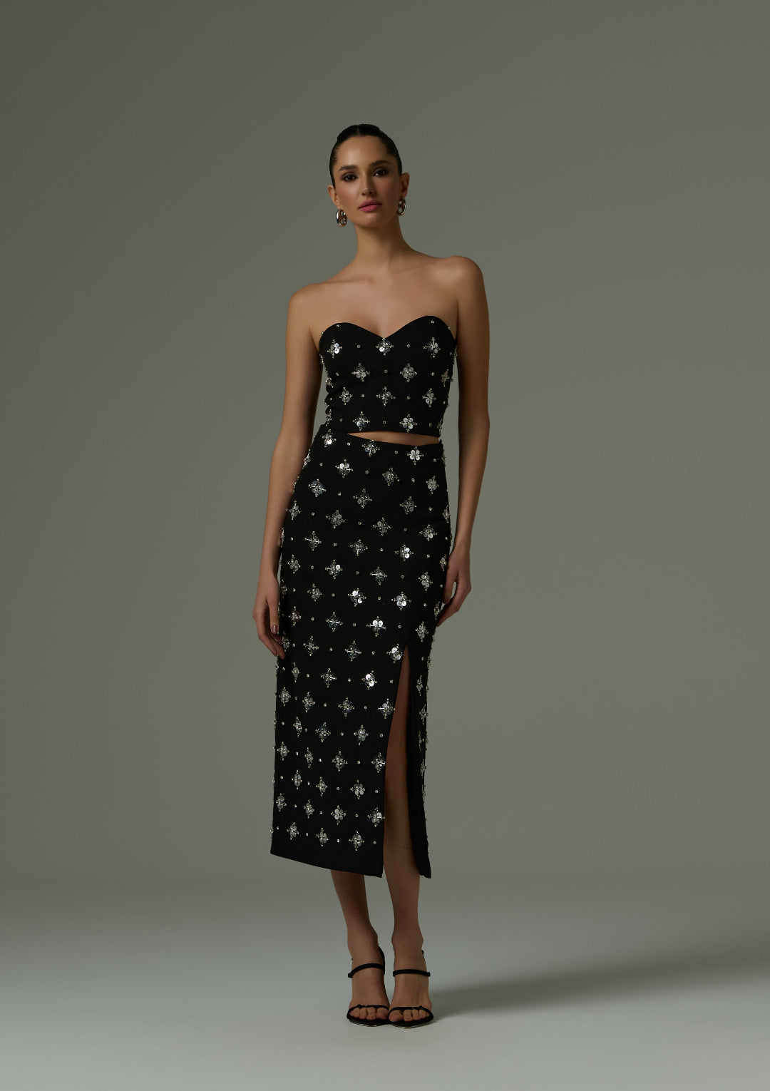 O Top Chile tomara que caia em crepe Zurique combina sofisticação e delicadeza. O decote coração valoriza o colo com elegância, enquanto a modelagem anatômica garante um ajuste impecável. O bordado manual, com um charmoso motivo floral retrô em paetês, vidrilhos e strass, adiciona brilho na medida certa. Uma peça refinada que une modernidade e feminilidade em cada detalhe.
