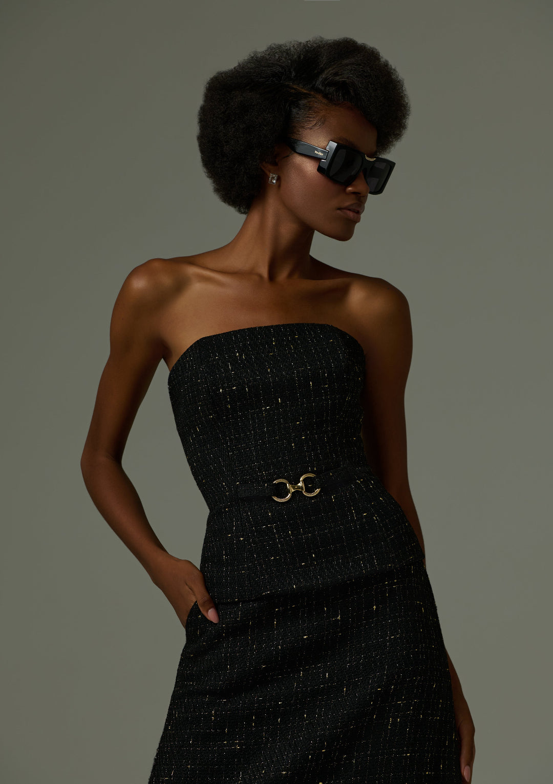 O Top Dipe celebra a força da simplicidade elevada ao luxo. Confeccionado em tweed com foil, tecido de textura sofisticada e pontos de brilho discretos, ele exibe um corte tomara que caia preciso e estruturado. O detalhe central em fivela metálica dourada acentua a cintura com sofisticação e reforça o estilo contemporâneo da peça.