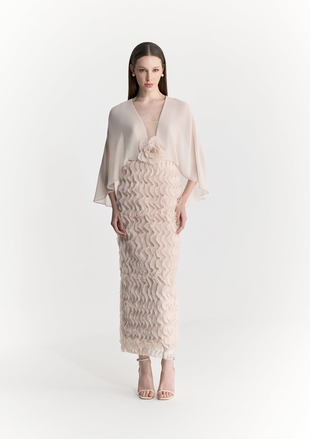 Este vestido é a escolha perfeita para quem busca um visual refinado e sofisticado. Com um design minimalista, o vestido apresenta uma saia com detalhes delicados em ondas, criando um efeito visual marcante. A parte superior com detalhes fluídos e o acabamento com flor na cintura trazem suavidade e feminilidade à peça. Ideal para eventos formais, como casamentos e jantares sofisticados, o vestido é perfeito para quem deseja se destacar com elegância.
