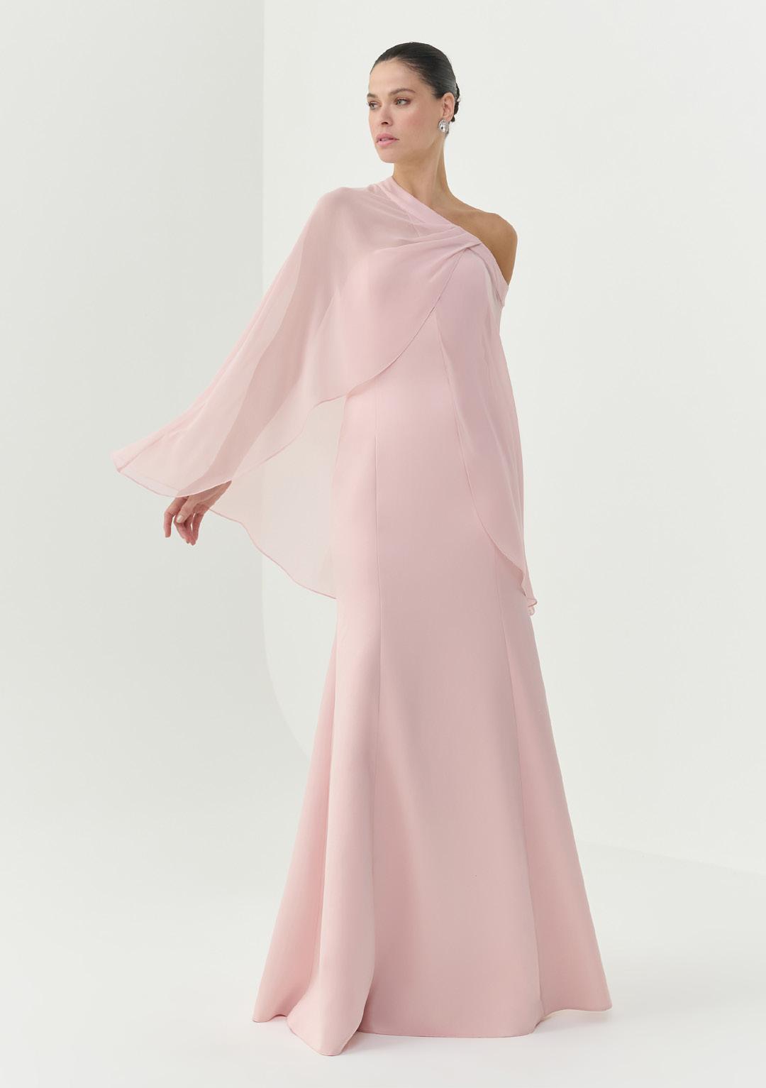 A peça é acompanhada de uma delicada pelerine em musseline, que se destaca pelo seu design inovador. O detalhe de sobreposição e a abertura na pelerine garantem liberdade de movimentos, criando um efeito de leveza e sofisticação sem comprometer o visual imponente e elegante.