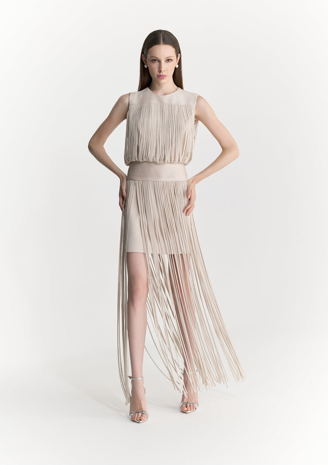 O Vestido Bianca é uma interpretação contemporânea do glamour, com sua silhueta sofisticada e toque de ousadia. Confeccionado em tom nude elegante, o modelo sem mangas apresenta blusa em efeito blusê com plissado vertical, e saia com franjas longas em camadas sobre uma base curta, criando transparência estratégica e movimento envolvente. A cintura marcada equilibra proporções e valoriza a silhueta feminina.