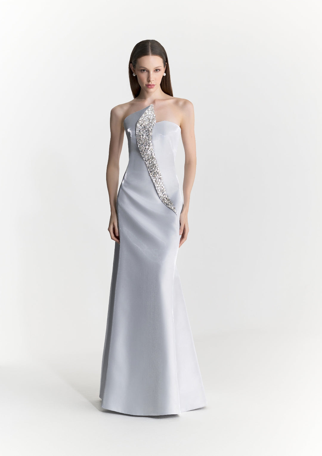 Um verdadeiro ícone de sofisticação contemporânea, o vestido longo da V.Condotti confeccionado em Zibeline Glow captura a essência do luxo refinado. Sua modelagem estruturada tomara-que-caia valoriza o colo com elegância, enquanto o bordado exclusivo com pedrarias cintilantes em recorte assimétrico proporciona um destaque artístico e escultural ao design minimalista.