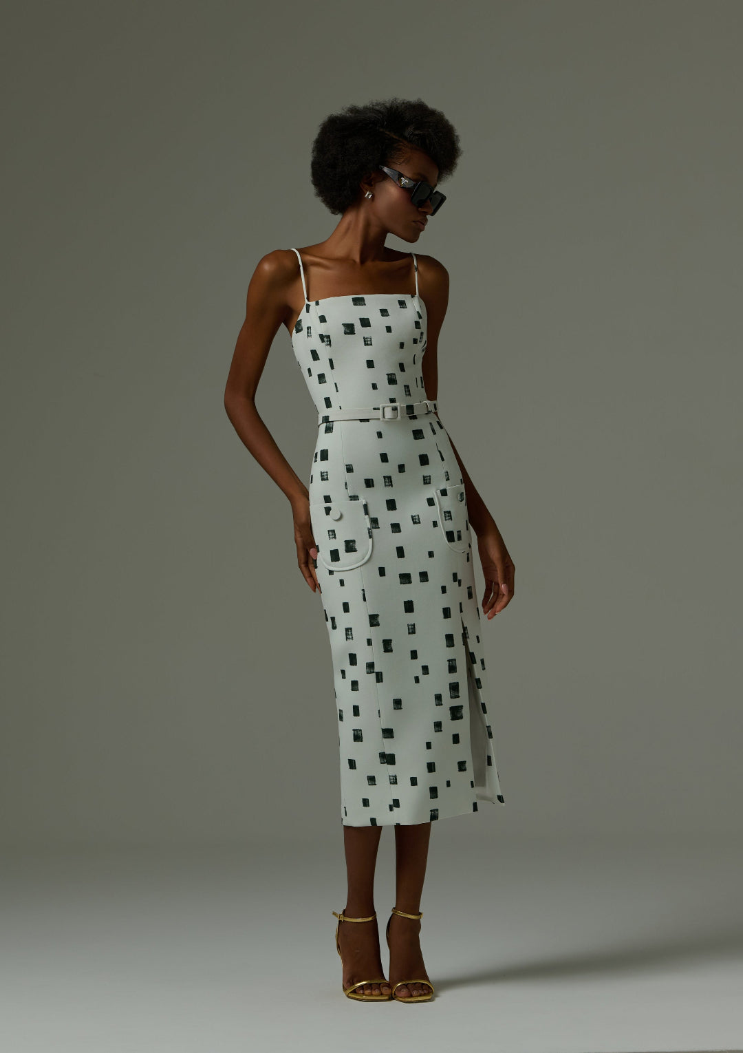 A modelagem midi com alças finas define o colo com leveza, enquanto o recorte ajustado ao corpo realça as curvas com sutileza. O cinto fino do mesmo tecido marca a cintura com delicadeza, e os bolsos frontais com corte arredondado trazem charme e funcionalidade. A fenda lateral oferece conforto e um toque de sensualidade, revelando movimento a cada passo.