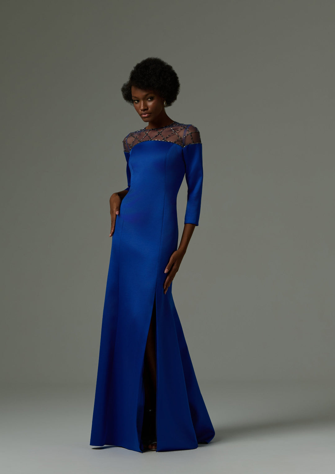 Vestido longo de festa em crepe royale, combinando sofisticação e delicadeza. Com manga 3/4 e decote redondo, o colo é elegantemente destacado com tule bordado à mão em losangos de vidrilhos, um trabalho minucioso que enaltece o brilho e a exclusividade da peça. A saia levemente rodada, com fenda lateral, proporciona movimento e leveza ao caminhar, enquanto o design clássico e refinado faz deste vestido uma escolha ideal para ocasiões especiais que pedem um visual glamouroso e único.