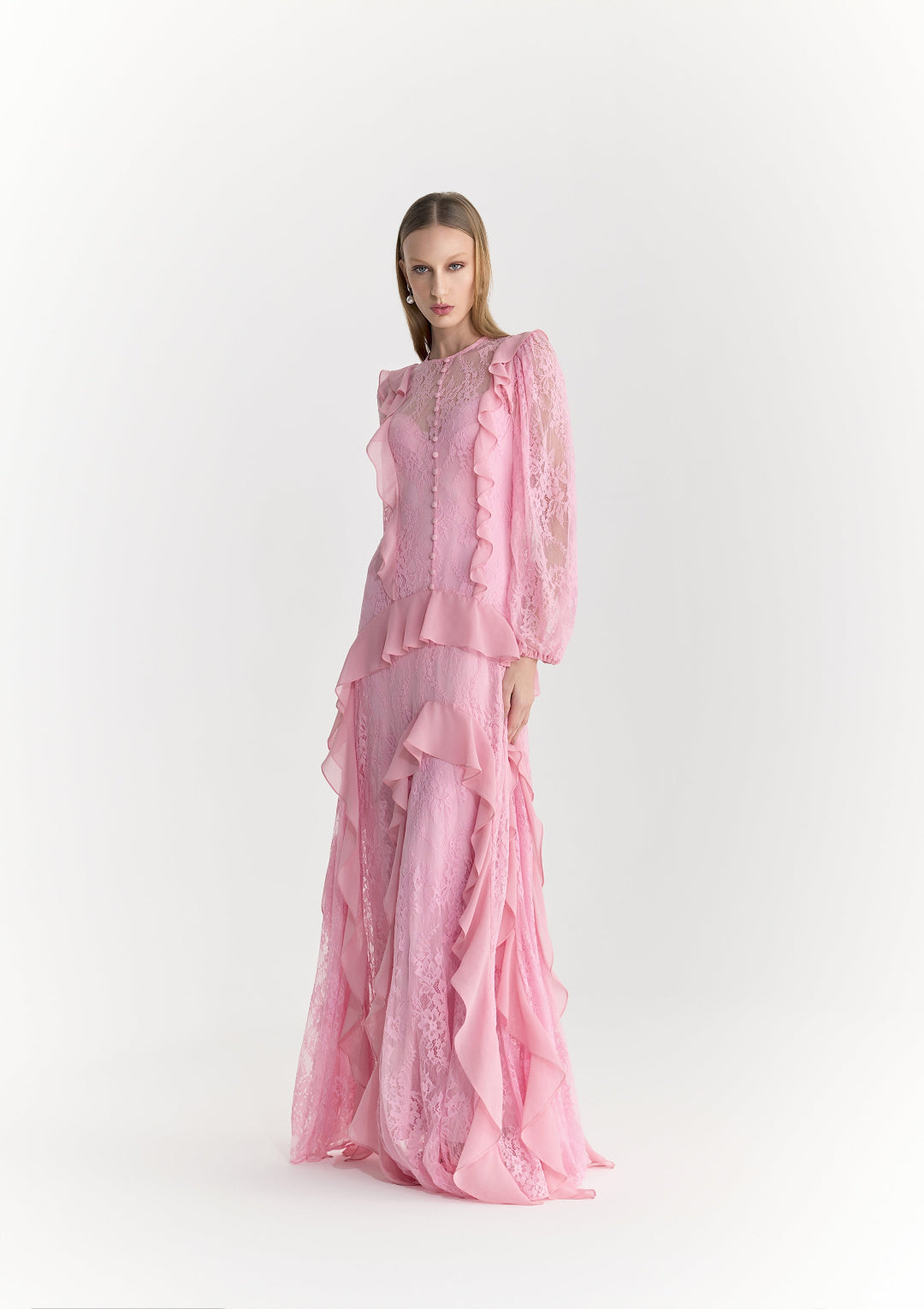 Este vestido longo de chiffon é a combinação perfeita entre sofisticação e delicadeza. Com detalhes em renda e babados, o vestido cria um efeito visual romântico e fluído. A modelagem, que acompanha a silhueta com delicadeza, e os babados ao longo do corpo conferem movimento e charme à peça. Ideal para ocasiões especiais como casamentos, jantares formais ou eventos de gala, este vestido é uma escolha elegante e atemporal.