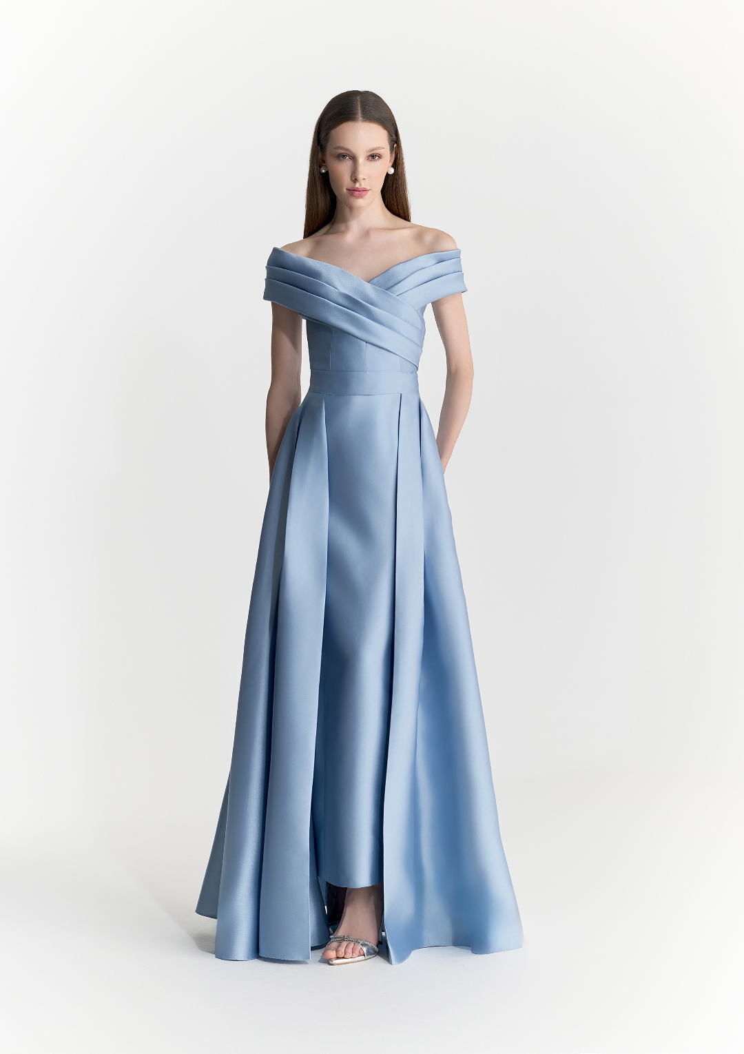 Este vestido longo da V.Condotti é confeccionado em zibeline de altíssima qualidade, tecido nobre conhecido por sua estrutura, leve brilho acetinado e caimento impecável. Com design inteligente e sofisticado, a peça traz duas formas de uso: com ou sem a sobreposição de saia drapeada, proporcionando versatilidade para diferentes ocasiões e estilos pessoais.