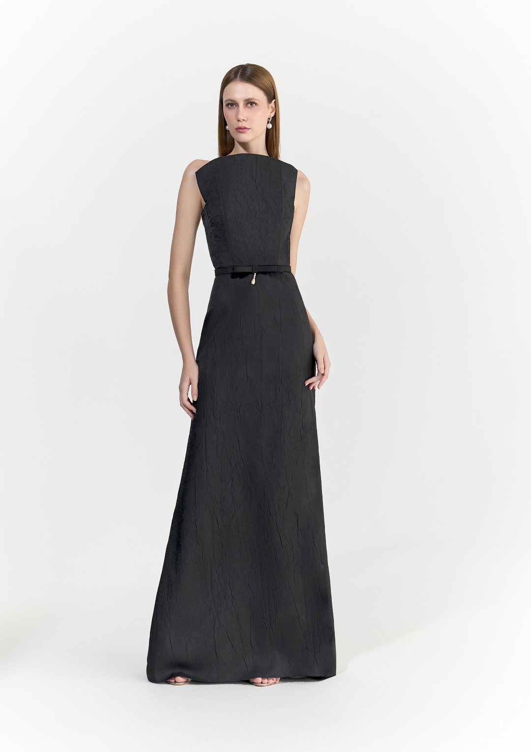 Este vestido longo da V.Condotti é a definição de sofisticação minimalista com presença marcante. Confeccionado no exclusivo tecido Textura Trend, ele traz um acabamento fosco com leve relevo orgânico, que adiciona profundidade e refinamento ao visual monocromático. A modelagem estruturada com decote reto geométrico e cintura marcada por cinto fino promove elegância atemporal e uma silhueta esculpida.