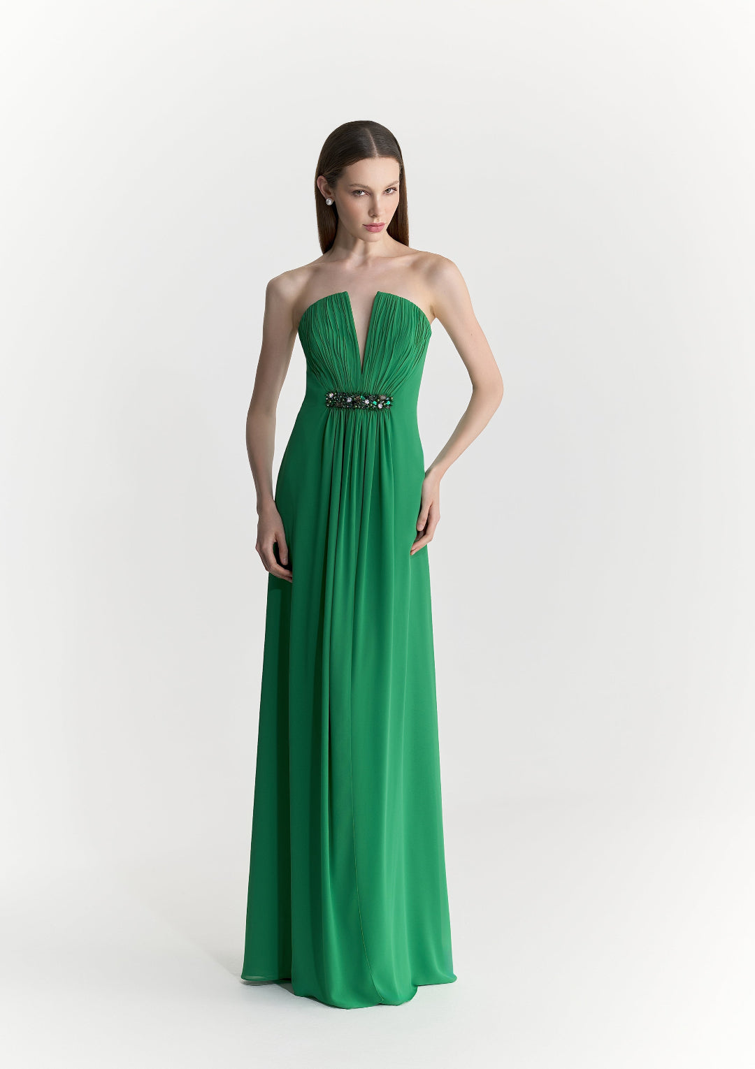 O modelo tomara que caia traz um decote coração com recorte profundo, enriquecido por drapeados delicados que valorizam o busto. O destaque fica por conta do cinto bordado à mão, que marca a cintura com brilho sutil e refinado. A saia ampla e leve proporciona fluidez e impacto visual, sem abrir mão do conforto.