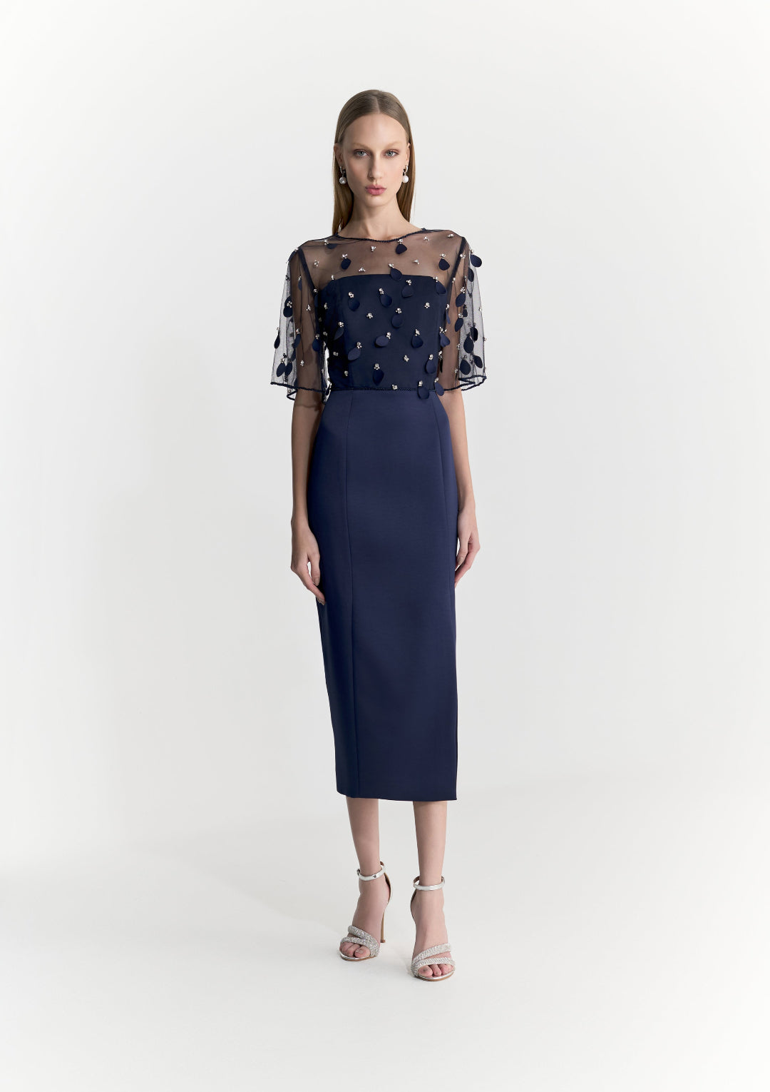 Este vestido midi em crepe royale é uma peça sofisticada e elegante, ideal para ocasiões especiais. Sua modelagem impecável e o toque delicado do tule bordado conferem um charme único, tornando-o a escolha perfeita para eventos formais e exclusivos.