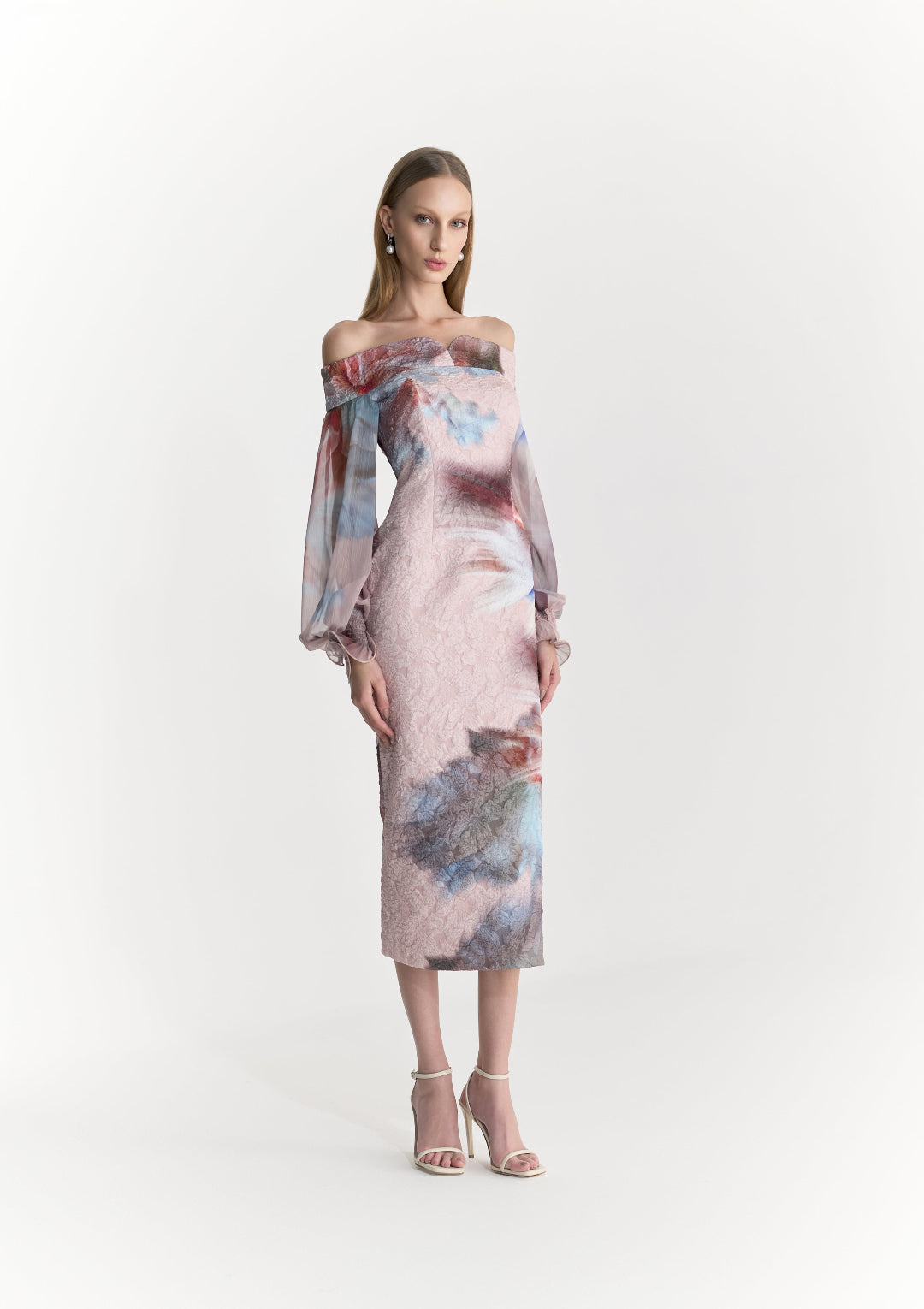 Este vestido midi é uma ode à feminilidade clássica com um toque de arte contemporânea. Confeccionado em jacquard estruturado com textura sofisticada, ele apresenta a estampa exclusiva Nouveau, inspirada em pinceladas de aquarela que se espalham com suavidade sobre o tecido. O decote ombro a ombro valoriza o colo, enquanto as mangas longas em tecido translúcido com leve volume imprimem leveza e sofisticação à silhueta.
