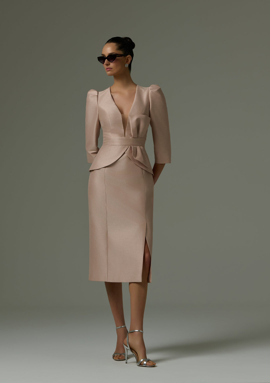 O Vestido Munique midi em shantung, exala sofisticação. Com decote V e mangas presunto de comprimento 3/4, sua cintura é marcada por um peplum delicado, complementado com um laço sutil. Sua saia, com fenda lateral, acrescenta um toque de sensualidade ao visual, perfeito para ocasiões sofisticadas e privadas. Uma peça que une elegância e modernidade de forma impecável.