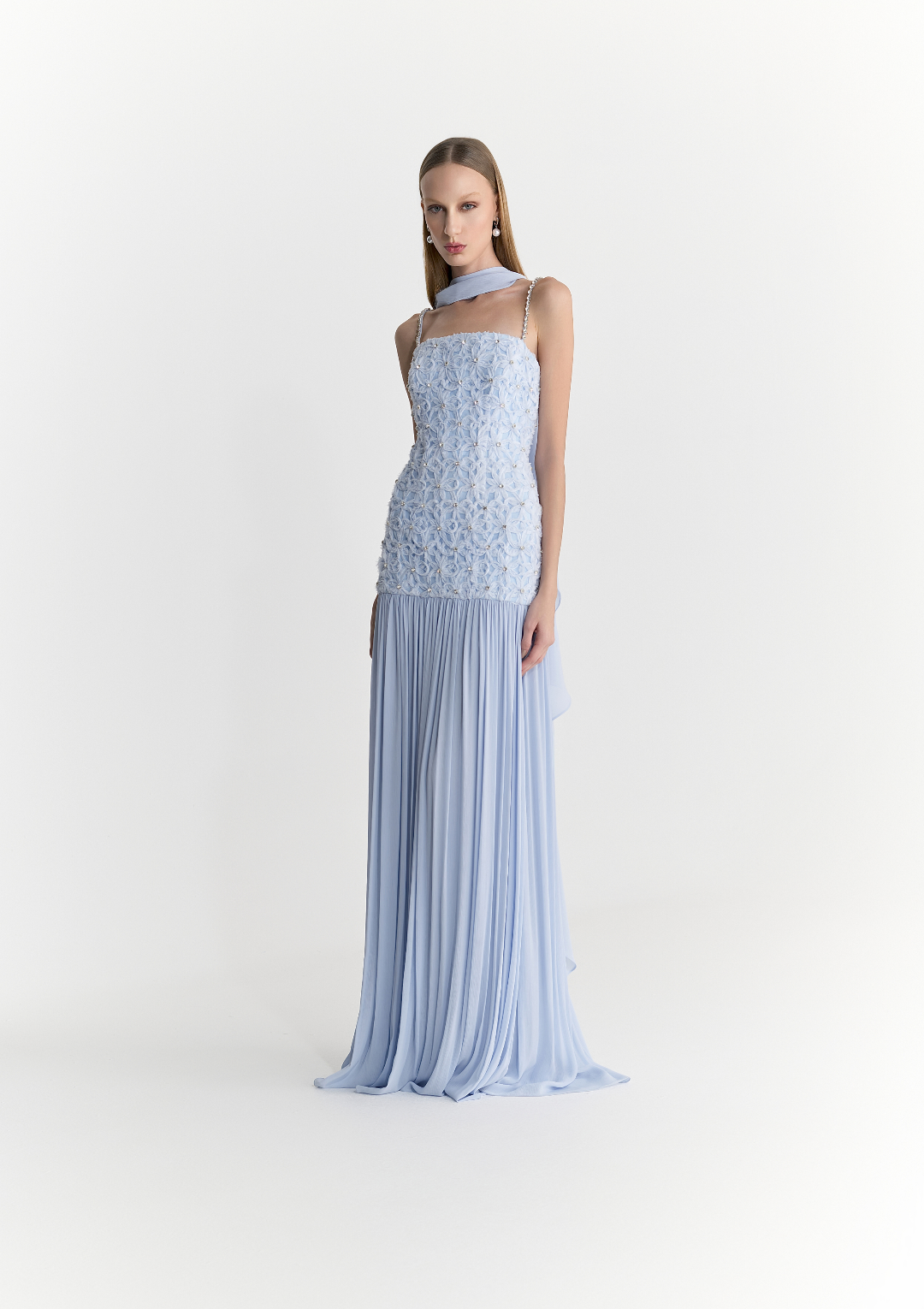 Este vestido longo da V.Condotti irradia sofisticação e delicadeza. Com busto bordado em aplicação floral 3D e alças finas com detalhes de pedraria, a peça combina perfeitamente o luxo artesanal com um caimento fluido e etéreo. A saia em chiffon plissado confere leveza e movimento, enquanto a faixa no pescoço adiciona um toque de elegância à silhueta esguia e refinada.