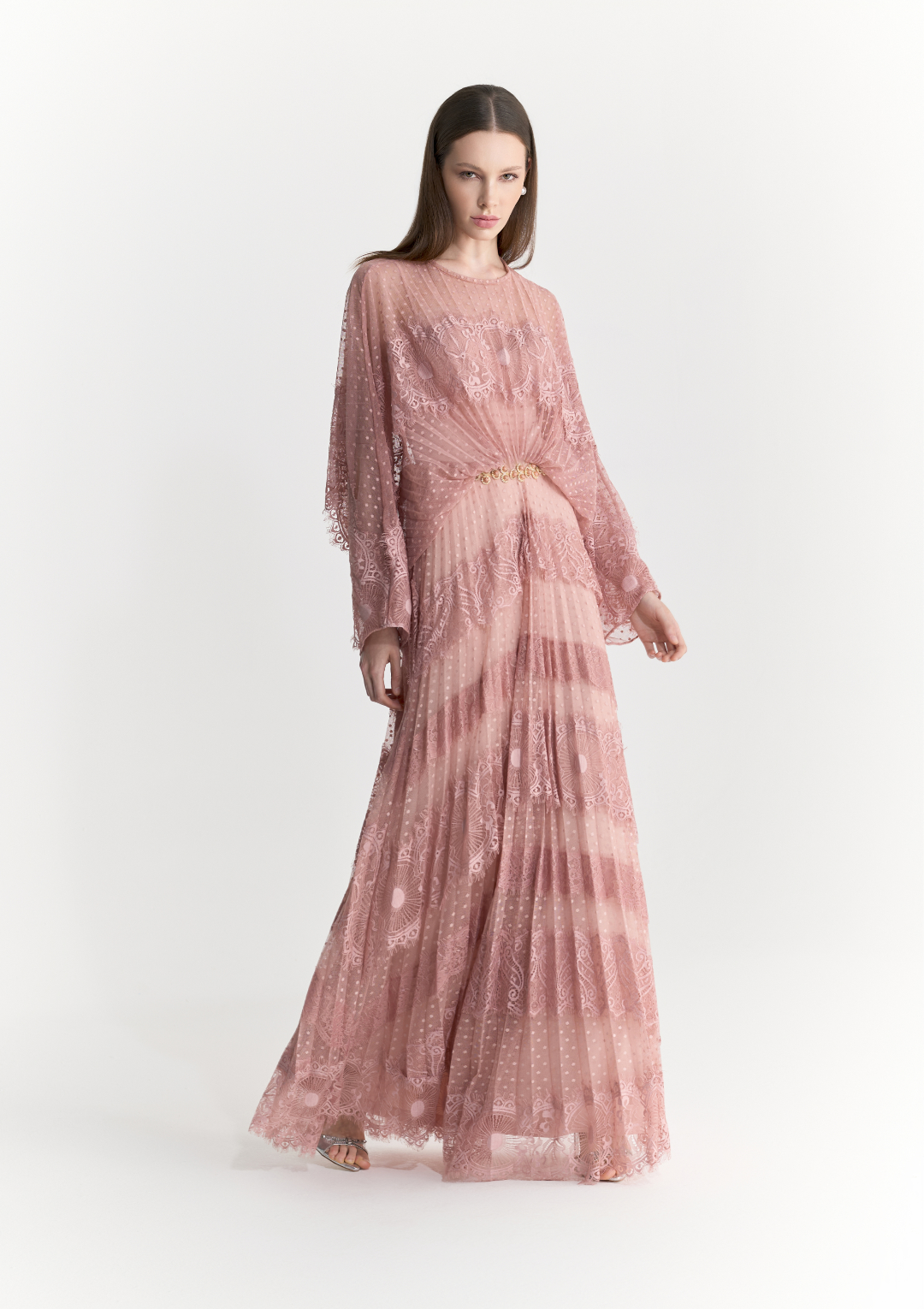 Vestido longo com mangas compridas e acabamento em renda