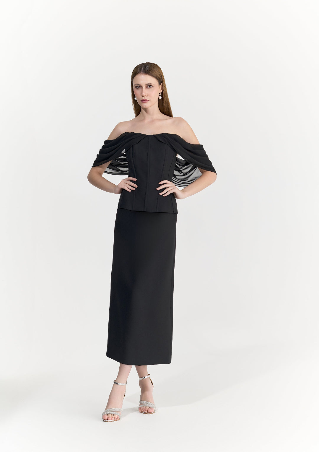 Destaque no Decote: O decote estruturado e a parte superior off-shoulder trazem um charme adicional à peça, criando um look moderno e sensual sem perder a sofisticação.