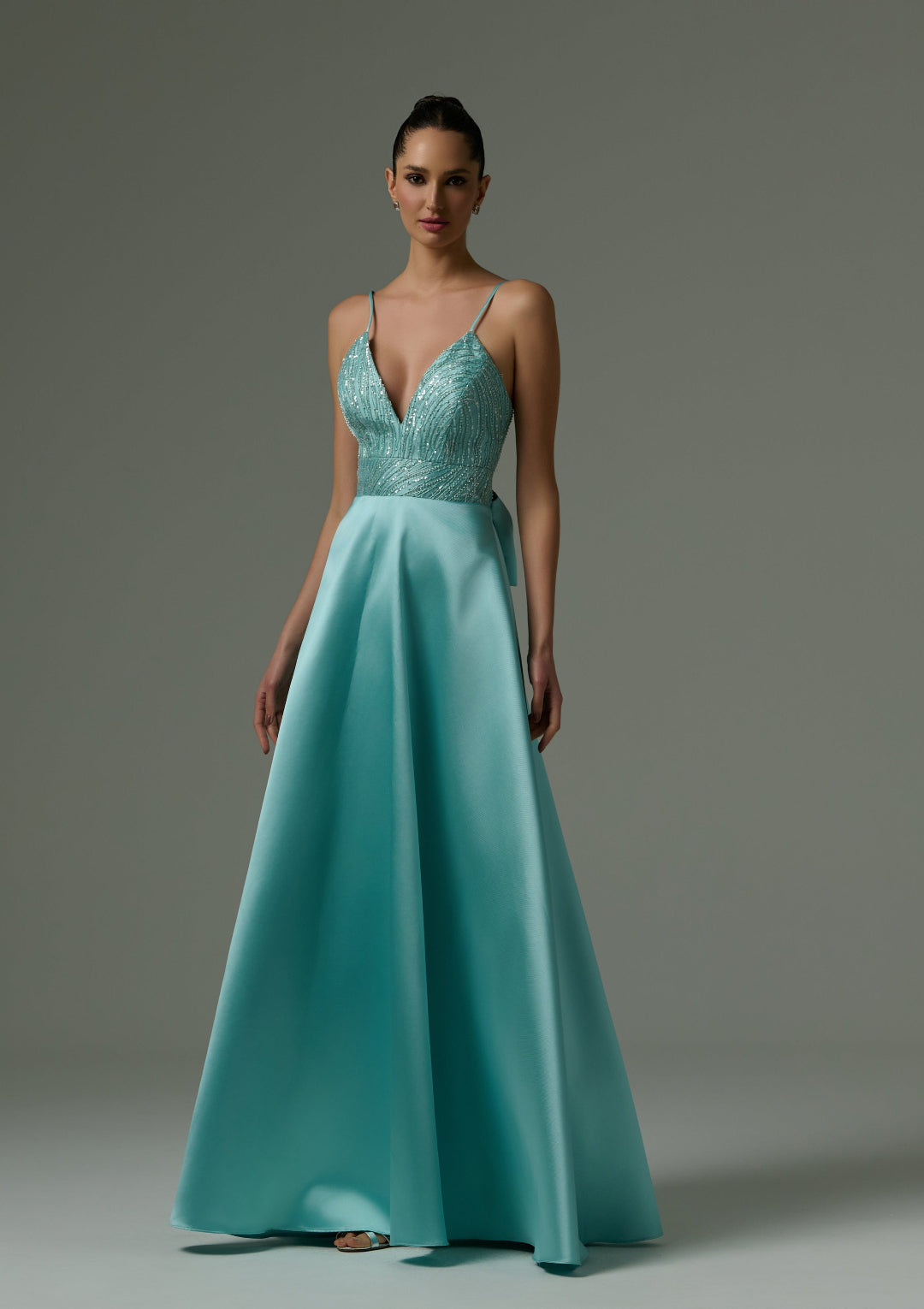 Este vestido longo em zibeline é o símbolo da sofisticação moderna. O corset de modelagem anatômica em renda bordada com paetês holográficos no tom do vestido, cria um brilho encantador que exalta a feminilidade com sutileza e glamour. A cintura marcada por um laço com amarração na parte de trás adiciona um toque romântico e delicado, enquanto a saia rodada, com seu caimento fluido e volumoso, proporciona movimento elegante a cada passo.