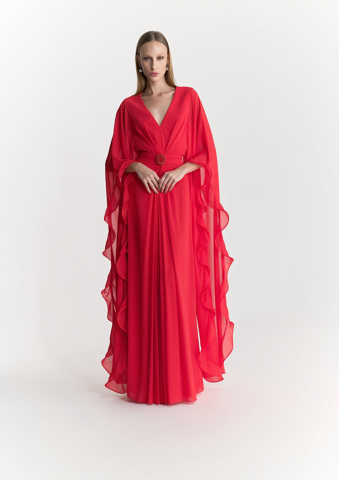 Impressione com a força da elegância clássica no Vestido Antonella, uma peça de alto impacto visual que combina sofisticação e drama com maestria. Confeccionado em tecido leve e esvoaçante, o modelo se destaca pelo caimento impecável e pela fluidez das mangas-capa, adornadas por babados orgânicos que acompanham os movimentos com leveza.